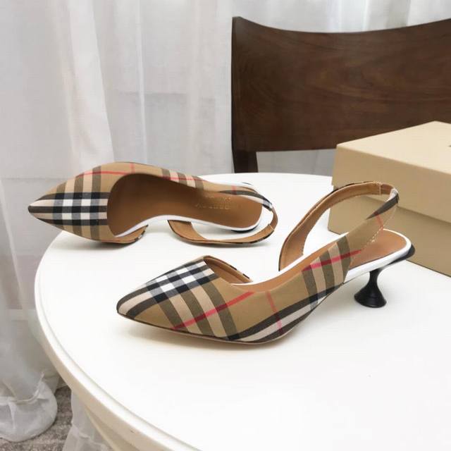 Actual Price: Heel height: 5.5cm, Size 35-40, Genuine leather outsole 220, Rubber outsole 200, Genuine leather outsole 240. Burberry Spring/Summer New Arrival, Pointed-toe High Heels, Decorated with Vintage Check Cotton Panels, Featuring an Open Heel Strap and Sturdy Kitten Heel. Upper: 100% Cotton, Lining: 100% Sheepskin, Outsole: 100% Calfskin, Elastic Open Heel Strap.