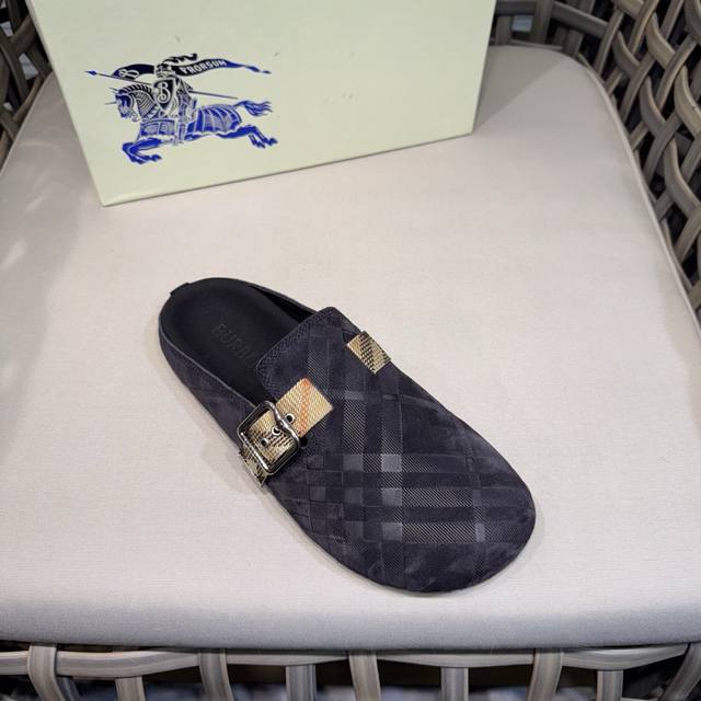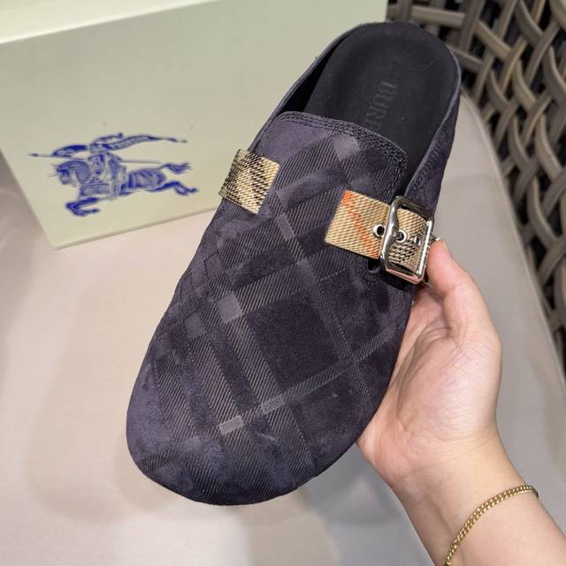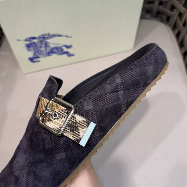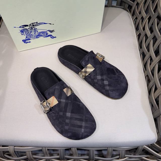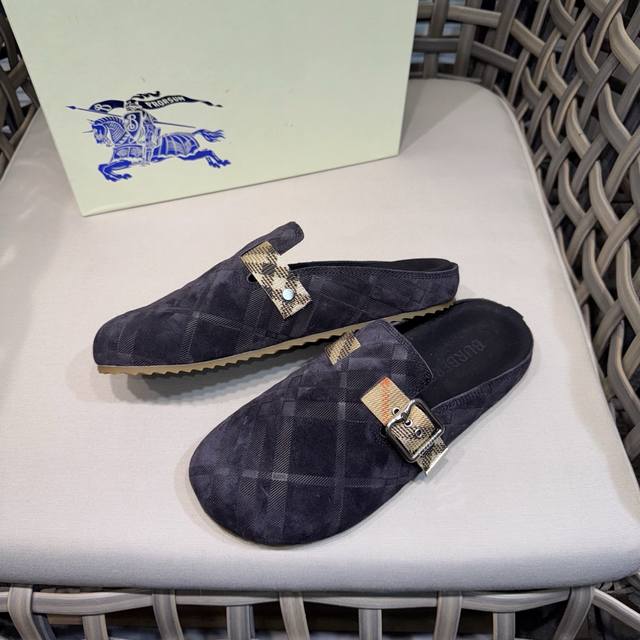 Factory direct price men's shoes and athletic shoes, original Burberry men's casual slippers | This athletic shoe features a soft suede upper with an embossed plaid pattern | paired with an embossed two-tone sole adorned with the brand logo | Features an adjustable B-shaped buckle strap | Full of relaxed comfort.