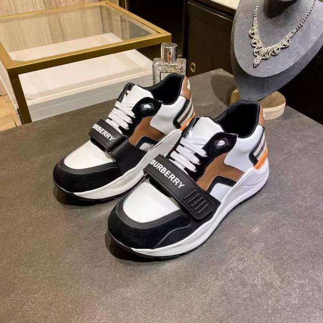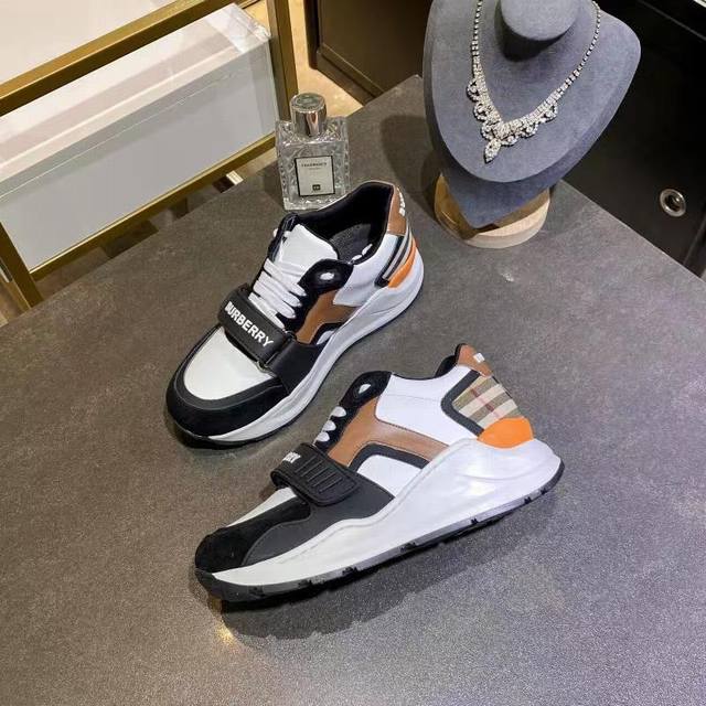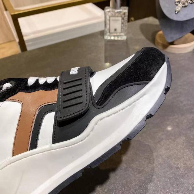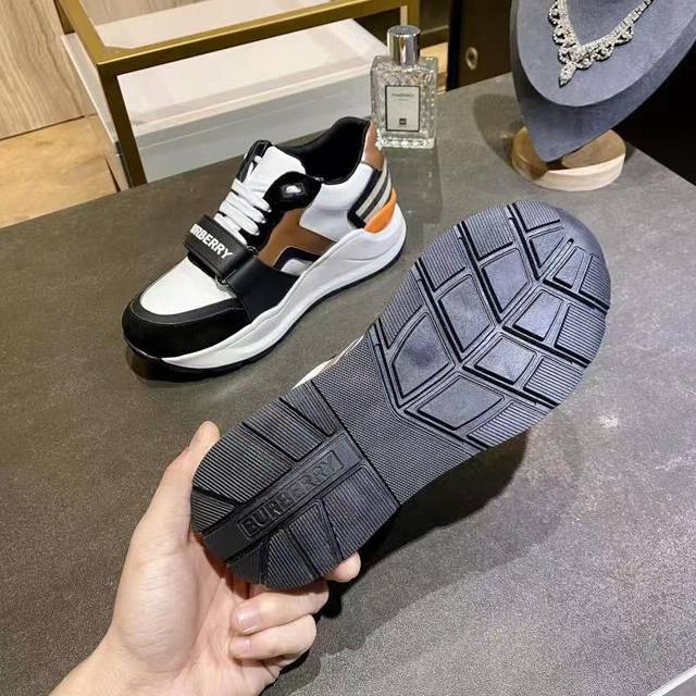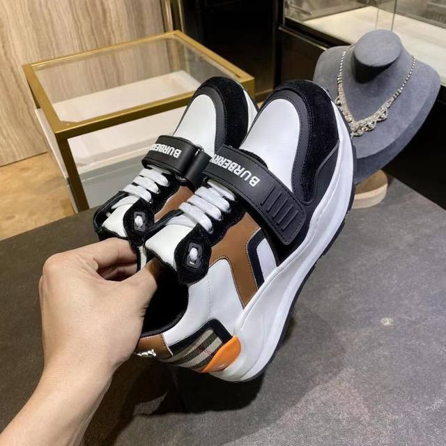 High-quality replica Burberry sneakers, newly added colors to the official store, high-end version, 1:1 replica. These are the latest Burberry autumn/winter platform sneakers, made with retro plaid, suede, and leather, featuring a prominent curved sole. Upper: 48% cotton, 52% calfskin; Lining: 60% polyester, 40% sheepskin; Sole: 100% rubber; Lace-up and Velcro buckle; Embossed Burberry logo on the shoulder strap; Printed Burberry logo on the heel. Women's sizes 35-40, Men's sizes 39-45. 1:1 replica packaging.