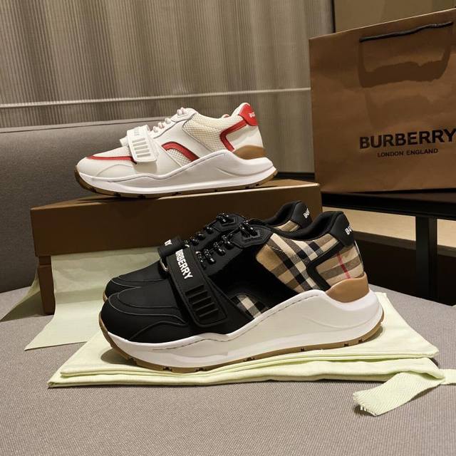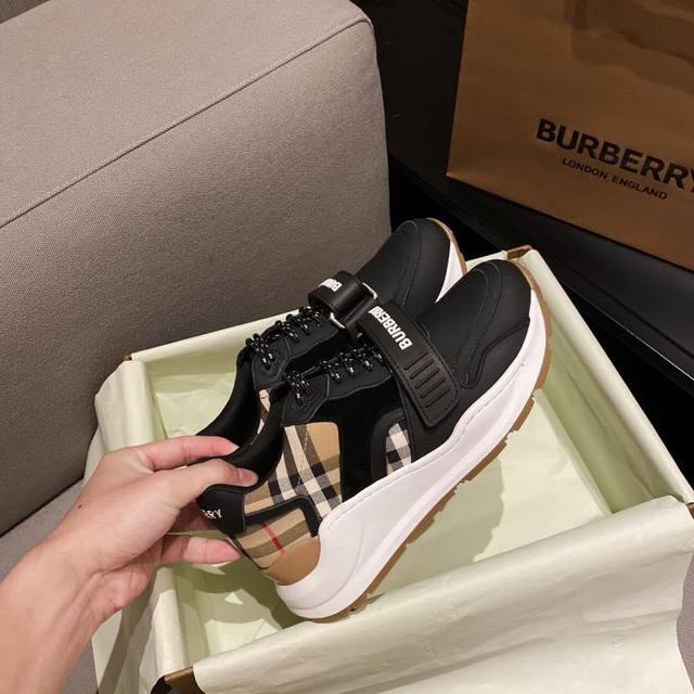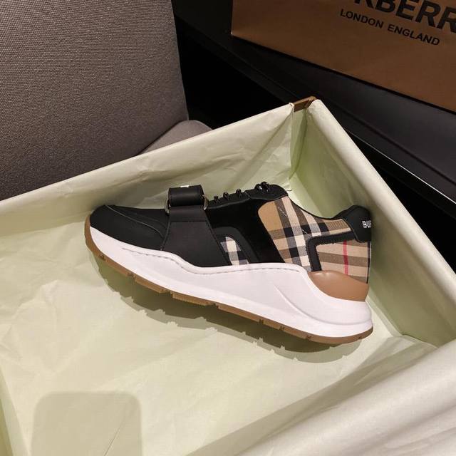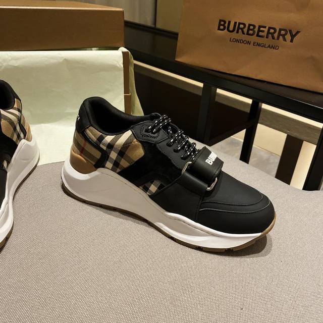 High-quality replica Burberry sneakers, newly added colors to the official store, high-end version, 1:1 replica. These are the latest Burberry autumn/winter platform sneakers, made with retro plaid, suede, and leather, featuring a prominent curved sole. Upper: 48% cotton, 52% calfskin; Lining: 60% polyester, 40% sheepskin; Sole: 100% rubber; Lace-up and Velcro buckle; Embossed Burberry logo on the shoulder strap; Printed Burberry logo on the heel. Women's sizes 35-40, Men's sizes 39-45. 1:1 replica packaging.