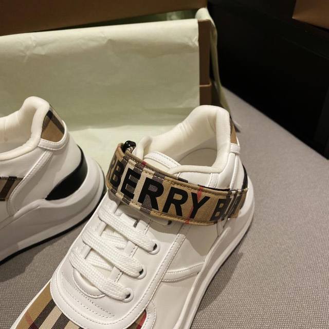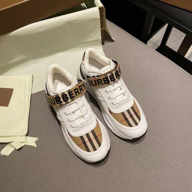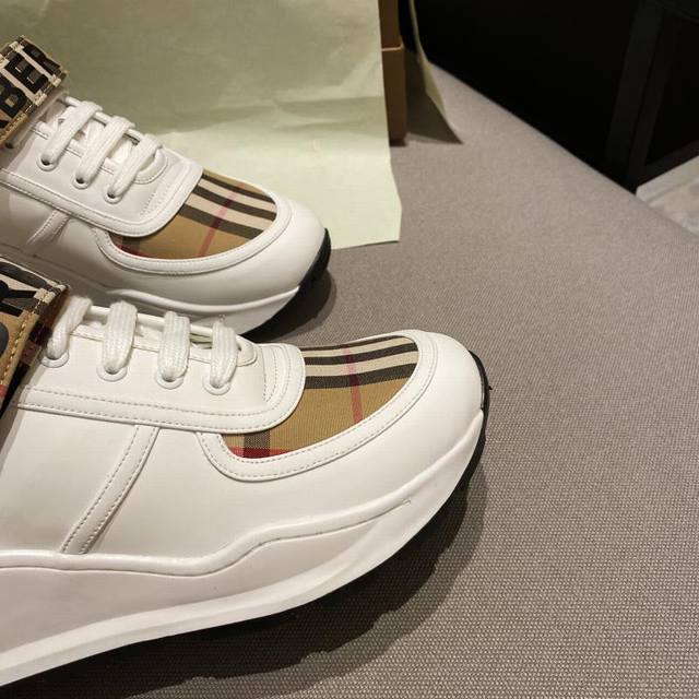 High-quality replica Burberry sneakers, newly added colors to the official store, high-end version, 1:1 replica. These are the latest Burberry autumn/winter platform sneakers, made with retro plaid, suede, and leather, featuring a prominent curved sole. Upper: 48% cotton, 52% calfskin; Lining: 60% polyester, 40% sheepskin; Sole: 100% rubber; Lace-up and Velcro buckle; Embossed Burberry logo on the shoulder strap; Printed Burberry logo on the heel; Women's sizes 35-40, Men's sizes 39-45; 1:1 replica packaging.