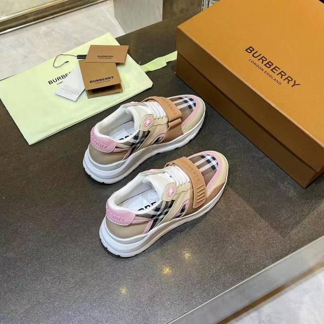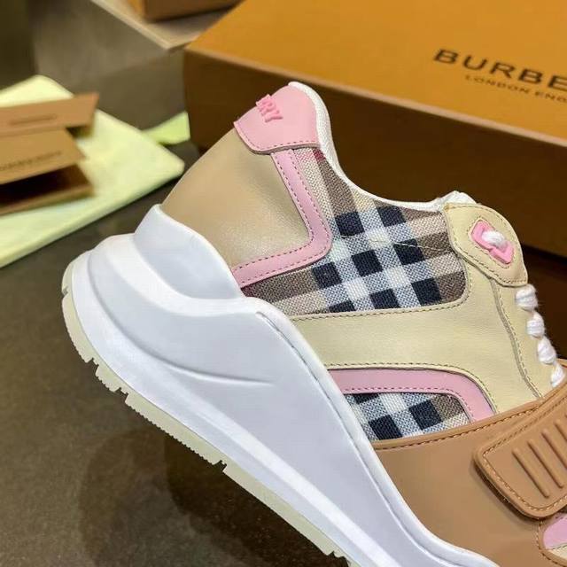 High-quality replica Burberry sneakers, newly added colors to the official store, high-end version, 1:1 replica. These are the latest Burberry autumn/winter platform sneakers, made with retro plaid, suede, and leather, featuring a prominent curved sole. Upper: 48% cotton, 52% calfskin; Lining: 60% polyester, 40% sheepskin; Sole: 100% rubber; Lace-up and Velcro buckle; Embossed Burberry logo on the shoulder strap; Printed Burberry logo on the heel. Women's sizes 35-40, Men's sizes 39-45. 1:1 replica packaging.