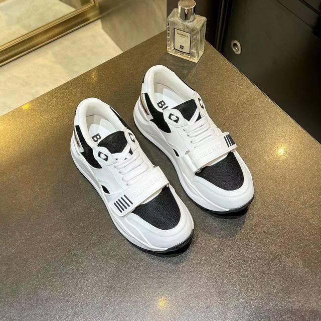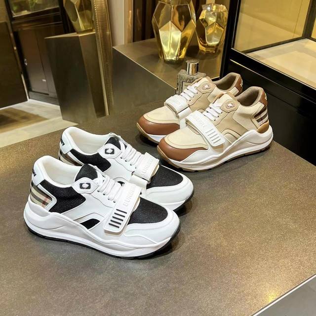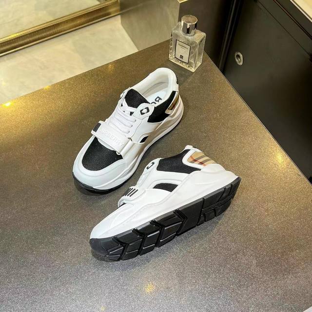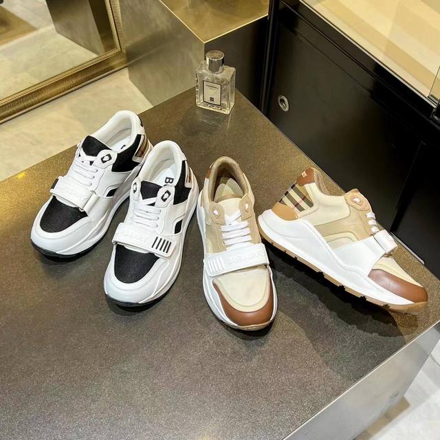 High-quality replica Burberry sneakers, newly added colors to the official store, high-end version, 1:1 replica. These are the latest Burberry autumn/winter platform sneakers, made with retro plaid, suede, and leather, featuring a prominent curved sole. Upper: 48% cotton, 52% calfskin; Lining: 60% polyester, 40% sheepskin; Sole: 100% rubber; Lace-up and Velcro buckle; Embossed Burberry logo on the shoulder strap; Printed Burberry logo on the heel. Women's sizes 35-40, Men's sizes 39-45. 1:1 replica packaging.