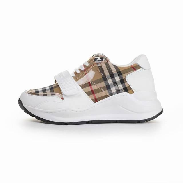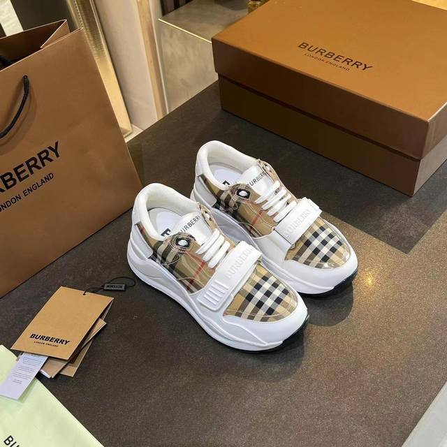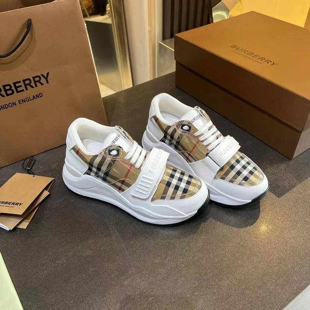 High-quality replica Burberry sneakers, newly added colors to the official store, high-end version, 1:1 replica. These are the latest Burberry autumn/winter platform sneakers, made with retro plaid, suede, and leather, featuring a prominent curved sole. Upper: 48% cotton, 52% calfskin; Lining: 60% polyester, 40% sheepskin; Sole: 100% rubber; Lace-up and Velcro buckle; Embossed Burberry logo on the shoulder strap; Printed Burberry logo on the heel. Women's sizes 35-40, Men's sizes 39-45. 1:1 replica packaging.