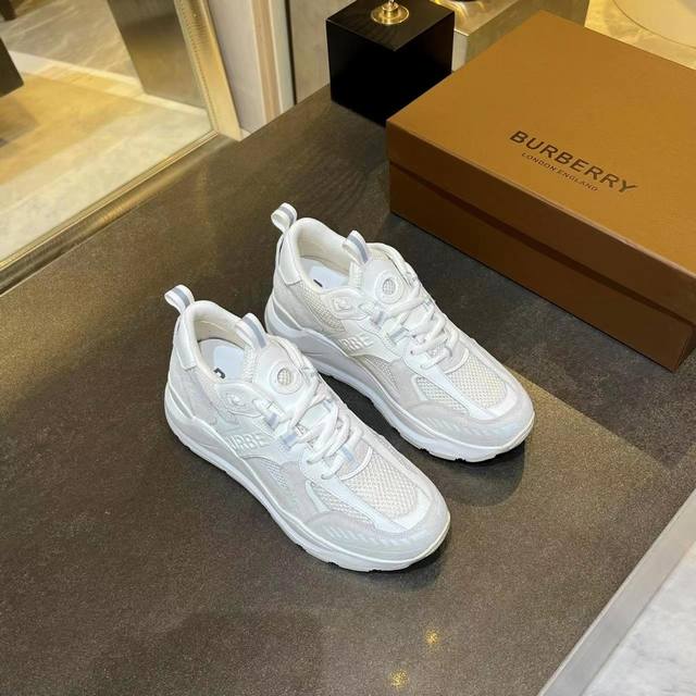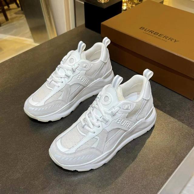 Latest high-end version from official stores, 1:1 replica of Burberry Fall/Winter 2023 platform sneakers. Made with retro plaid, suede, and leather, featuring a prominent curved sole. Upper: 48% cotton, 52% calfskin; Lining: 60% polyester, 40% sheepskin; Sole: 100% TPU. Features laces and Velcro buckle, embossed Burberry logo on the shoulder strap, and printed Burberry logo on the heel. Women's sizes 35-40, men's sizes 39-45. 1:1 replica packaging.