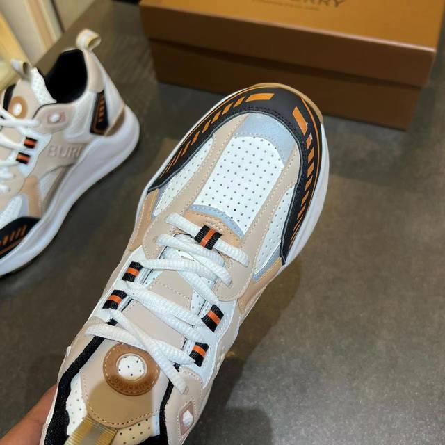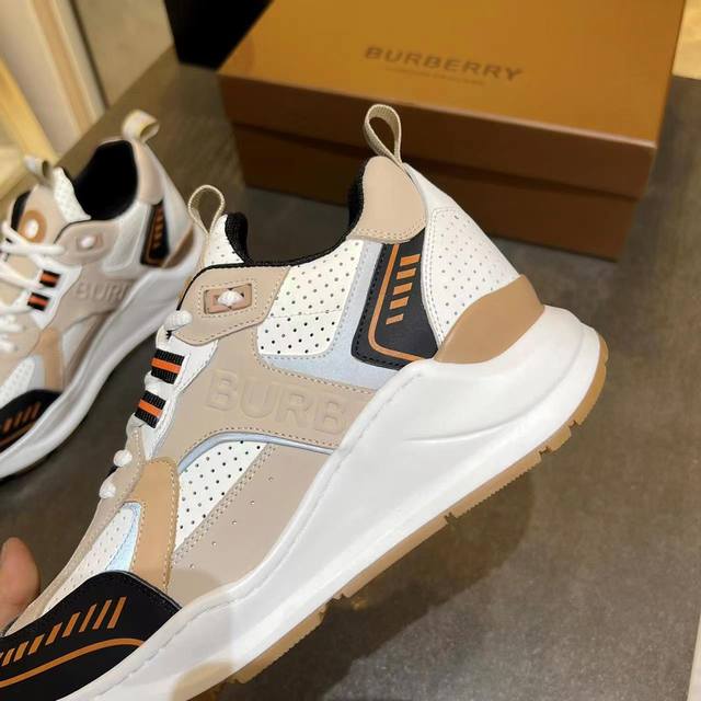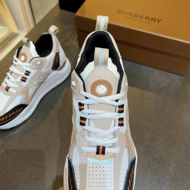 Latest high-end version from official stores, 1:1 replica of Burberry Fall/Winter 2023 platform sneakers. Made with retro plaid, suede, and leather, featuring a prominent curved sole. Upper: 48% cotton, 52% calfskin; Lining: 60% polyester, 40% sheepskin; Sole: 100% TPU. Features laces and Velcro buckle, embossed Burberry logo on the shoulder strap, and printed Burberry logo on the heel. Women's sizes 35-40, men's sizes 39-45. 1:1 replica packaging.