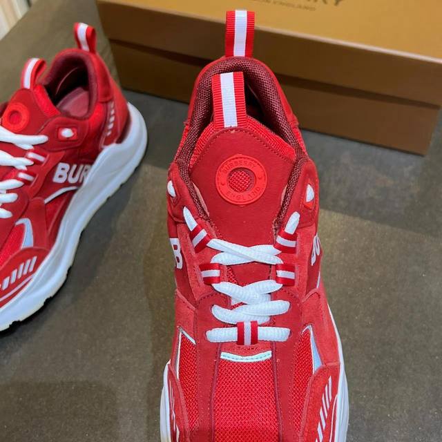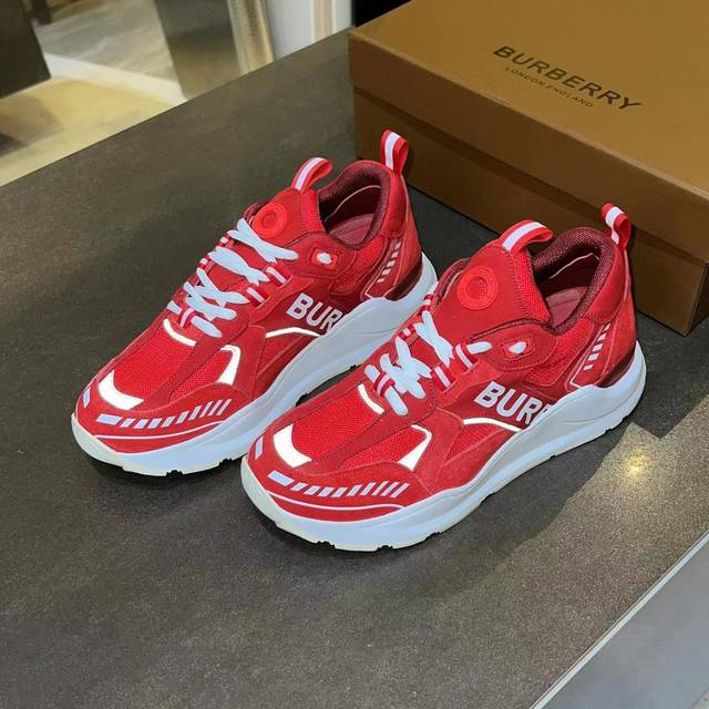 Latest high-end version from official stores, 1:1 replica of Burberry Fall/Winter 2023 platform sneakers. Made with retro plaid, suede, and leather, featuring a prominent curved sole. Upper: 48% cotton, 52% calfskin; Lining: 60% polyester, 40% sheepskin; Sole: 100% TPU. Features laces and Velcro buckle, embossed Burberry logo on the shoulder strap, and printed Burberry logo on the heel. Women's sizes 35-40, men's sizes 39-45. 1:1 replica packaging.
