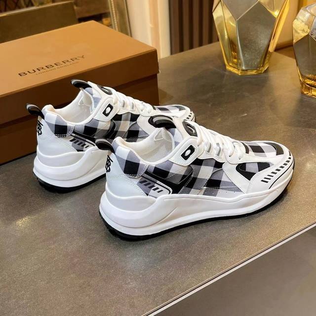 Latest high-end version from official stores, 1:1 replica of Burberry Fall/Winter 2023 platform sneakers. Made with retro plaid, suede, and leather, featuring a prominent curved sole. Upper: 48% cotton, 52% calfskin; Lining: 60% polyester, 40% sheepskin; Sole: 100% TPU. Features laces and Velcro buckle, embossed Burberry logo on the shoulder strap, and printed Burberry logo on the heel. Women's sizes 35-40, men's sizes 39-45. 1:1 replica packaging.