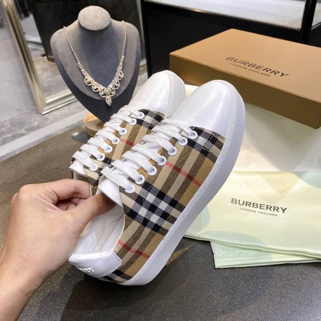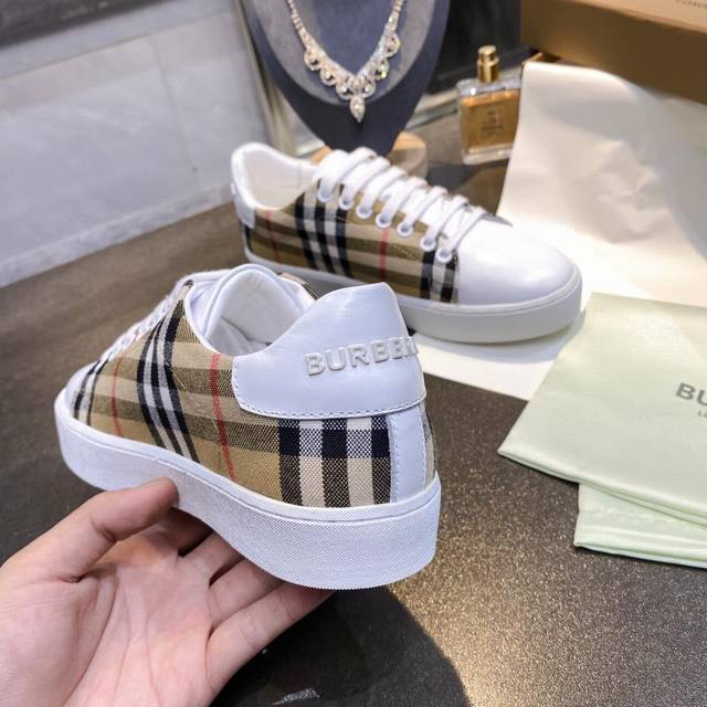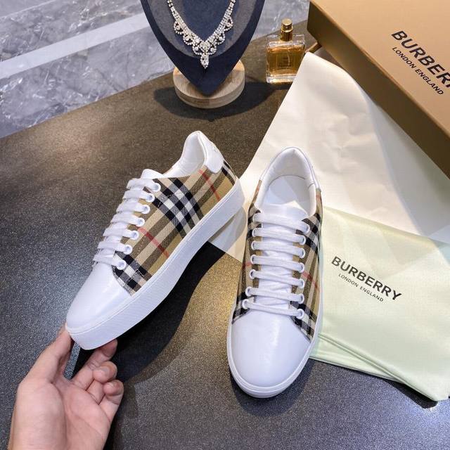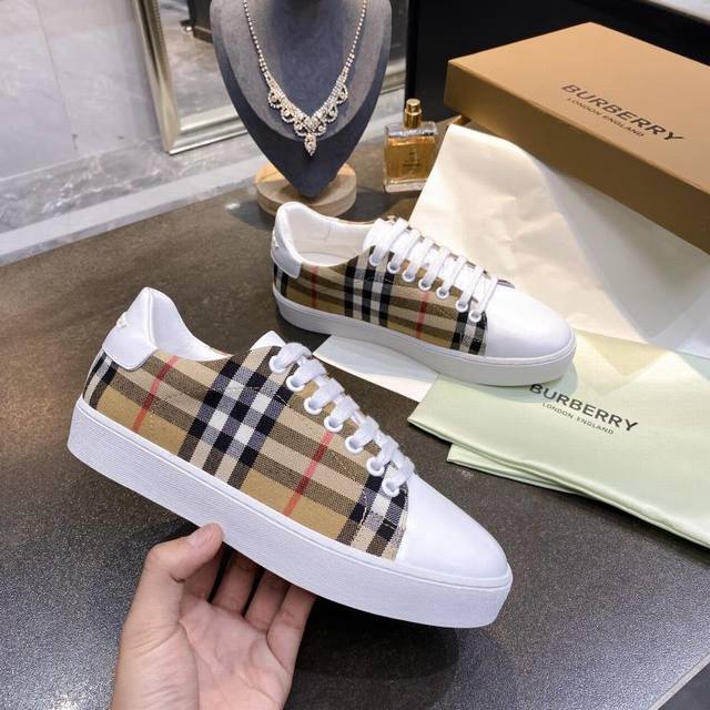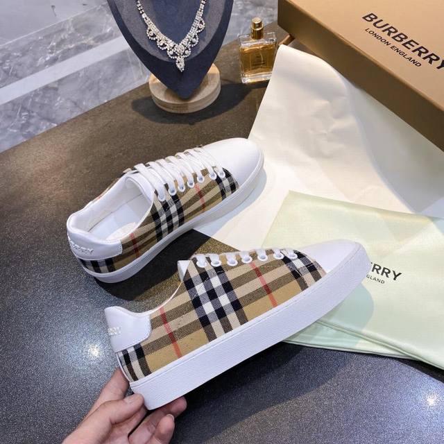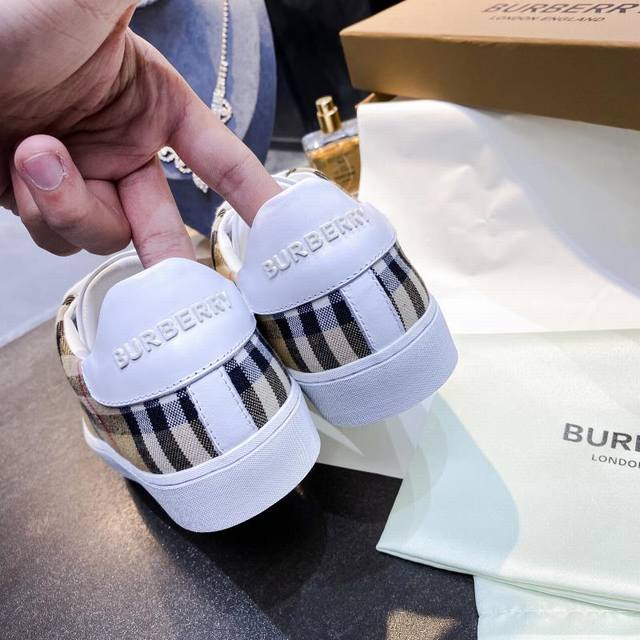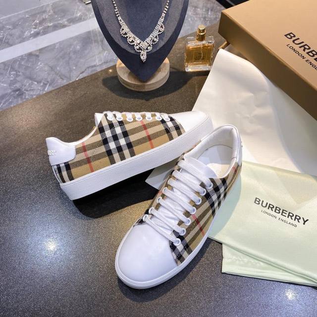 Real Price: Burberry Italian-made sneakers, decorated with a vintage check pattern, paired with smooth leather elements, and adorned with a logo pattern at the ankle. Upper: 60% cotton, 40% calfskin. Lining: 100% sheepskin. Sole: 100% polyurethane. Lace-up closure. Burberry 3D logo on the heel. Sizes 35-40, men's 39-44, 45, custom-made.