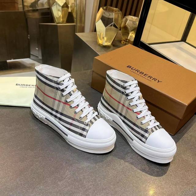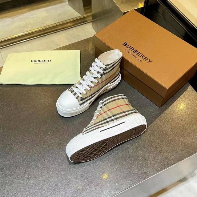 Real Price: High-top Burberry retro plaid cotton sneakers, a new color added to the official store. Made with original 5D printed material featuring a striking new logo. The upper is made of original plaid fabric, and the lining is 100% sheepskin. Women's sizes 35-40, men's sizes 39-45. (DDD)