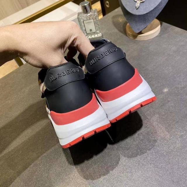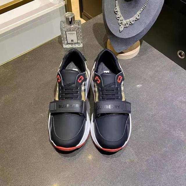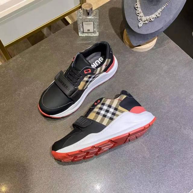Real Price: New color added to the official store, high-end version, 1:1 replica of the official store model. Burberry's latest autumn/winter platform sneakers, made with retro check, suede, and leather, featuring a prominent curved sole. Upper: 48% cotton, 52% calfskin; Lining: 60% polyester, 40% sheepskin; Sole: 100% rubber; Lace-up and Velcro buckle; Embossed Burberry logo on the shoulder strap; Printed Burberry logo on the heel; Women's sizes 35-40, Men's sizes 39-45; 1:1 replica packaging.