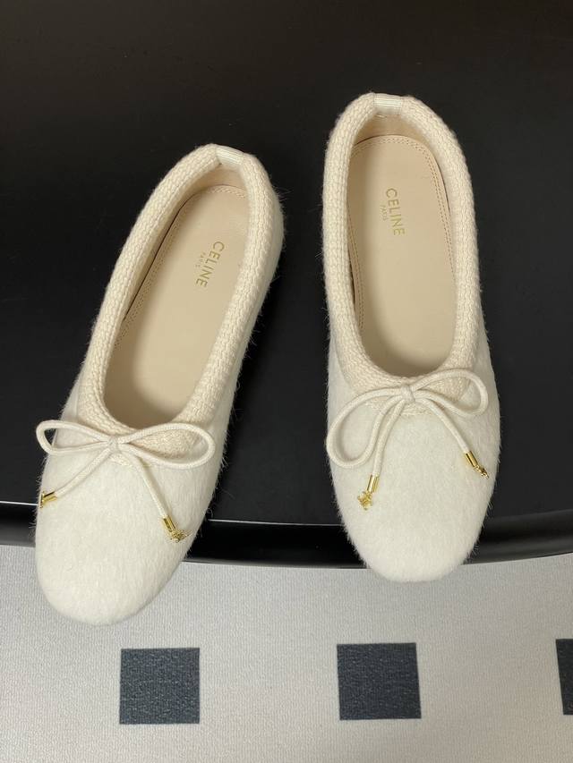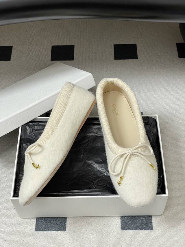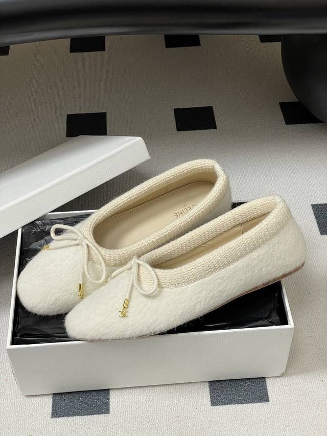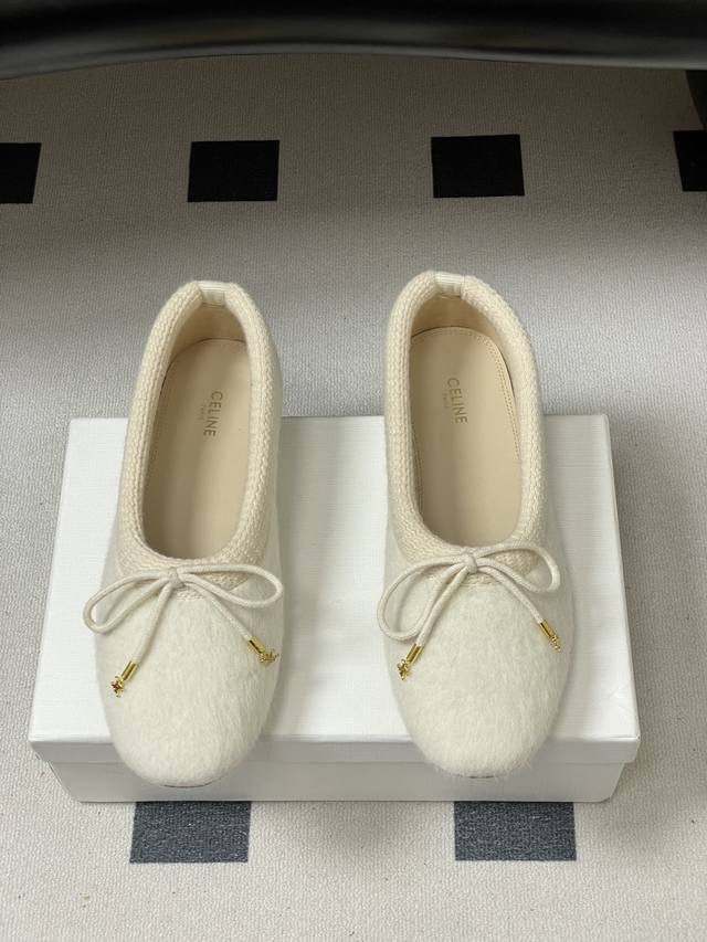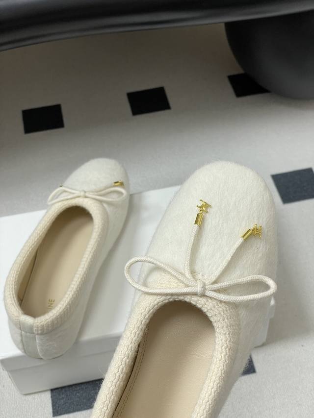 25Fw Autumn/Winter New Celine Bow Knitted Fur Flat Ballet Flats with Wool Lining DDD When the graceful beauty of ballet meets the languid elegance of bourgeois style, these ballet flats weave stage poetry into everyday steps, capturing effortless French elegance. The classic rounded-square toe continues the brand's clean lines, with a minimalist base laid out in low-saturation earth tones, subtly echoing Celine's consistent minimalist aesthetic. DDD The fluttering bow on the toe is the finishing touch, creating a contrast between strength and softness with the knitted texture, just like the brand's ingenious design of incorporating bows into tailored suits. The details of hand-stitching in the Italian workshops are hidden in the stitches. These shoes, with the warmth of the knit, the softness of the fur, and the sweetness of the bow, reinterpret the contemporary expression of ballet style, becoming a flowing footnote to French sophistication. DDD Upper: Knitted wool DDD Insole: Sheepskin DDD Outsole: Italian genuine leather DDD Sizes: 35-39 Size 40 is custom-made, no returns or exchanges DDD