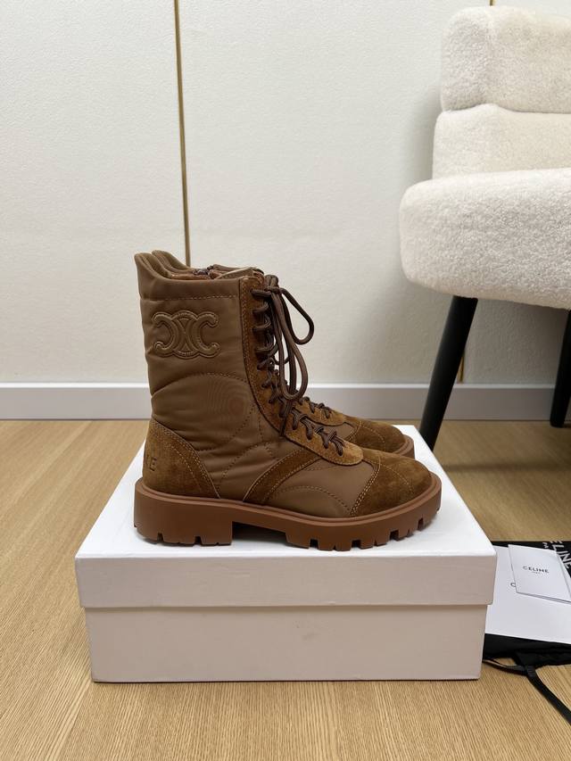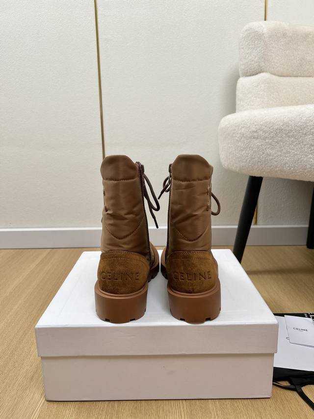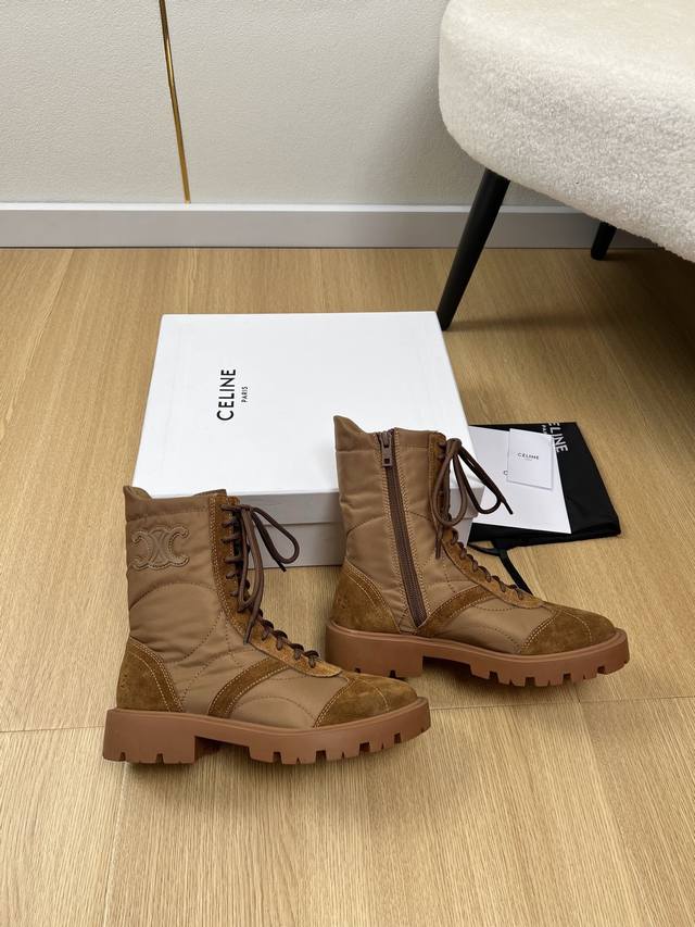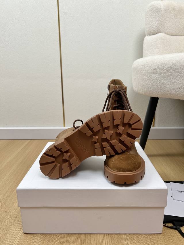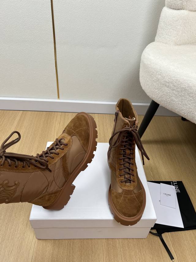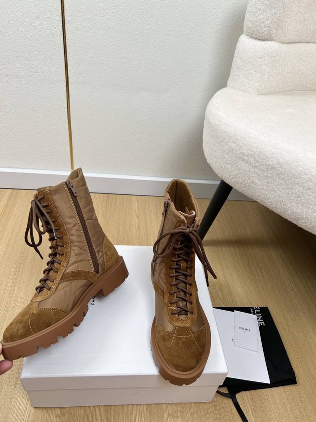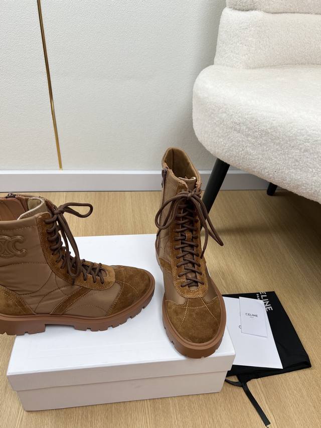 Celine 2025 2025 Autumn/Winter New Arrival - Latest Lace-up Ankle Boots, Martin Boots Series. Upper: Original custom cow suede + special waterproof nylon fabric. Lining: Custom cowhide lining + breathable mesh. Outsole: Original molded outsole. Heel height: 3.5cm. Sizes: 35-41. Sizes 40 and 41 are custom-made and non-refundable. Factory price.