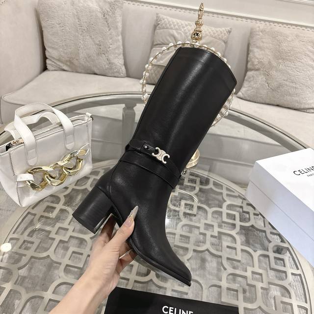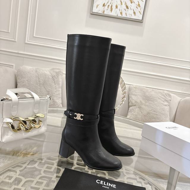 Celine 2025 Autumn/Winter Newest Rider Boots! Highly recommended by celebrities, influencers, and fashion bloggers! A must-have for retro European and American style, featuring the Arc de Triomphe brand logo for a high-end and sophisticated look. Professionally tailored for super comfortable wear. Upper: Original custom calfskin. Lining: Imported cowhide. Heel height: 6cm. Outsole: Italian imported genuine leather. Sizes: 35-40. Sizes 41 and 42 are custom-made and non-refundable. Factory price: [Price not specified]