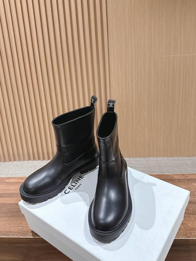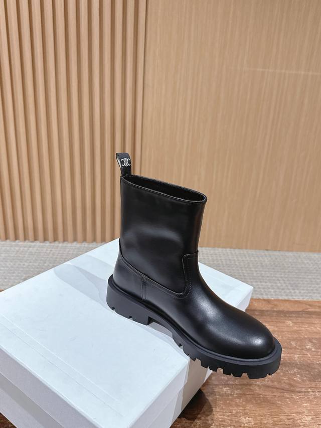 Celine 2025 Fall/Winter Bumargaret High Boots Collection: Color-blocked slip-on ankle boots with cross-over buckle design, elasticated canvas ankle boots paired with glossy cowhide Martin boots, rounded toe, logo silkscreen on the heel, Arc de Triomphe logo on the outer side of the tall boot shaft, exclusive developed rubber outsole, 3cm thick sole. Sizes: 35-41 (40/41 - Custom orders are non-refundable/non-exchangeable).