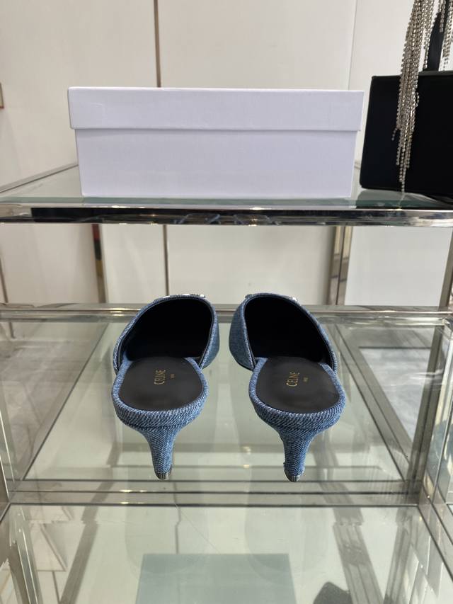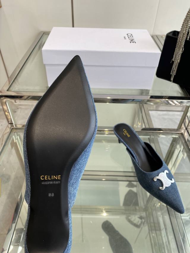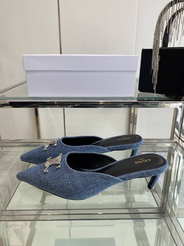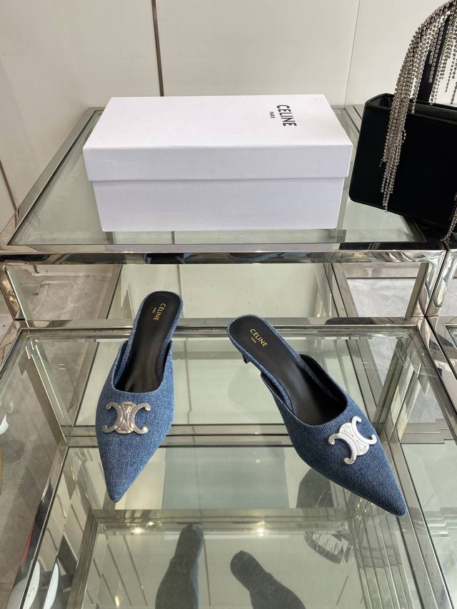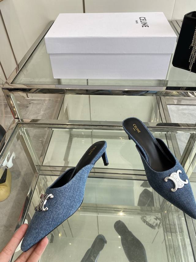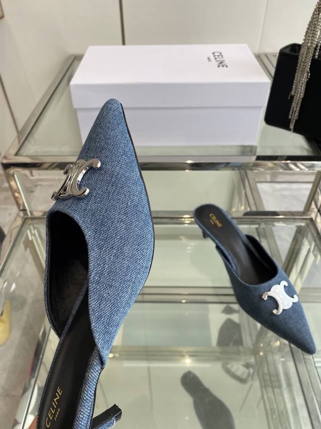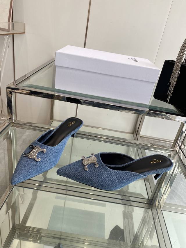 Celine 25Ss New Arc de Triomphe Kitten Heel Sandals with Metal Buckle and Open Back, Sexy and Elegant Pointed Toe Single Shoes, Clean and Neat, 5cm Kitten Heel. Super flattering and slimming, perfect for wearing alone or with wide-leg pants. A high-street yet retro look. Be a Celine girl! Upper: Imported denim fabric. Lining: Sheepskin lining. Outsole: Original genuine leather outsole. Sizes: 35-39, 40 (Custom Made).