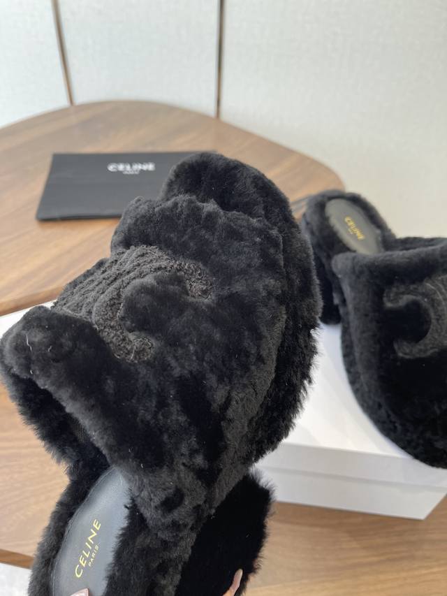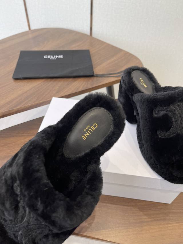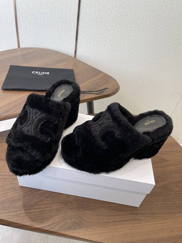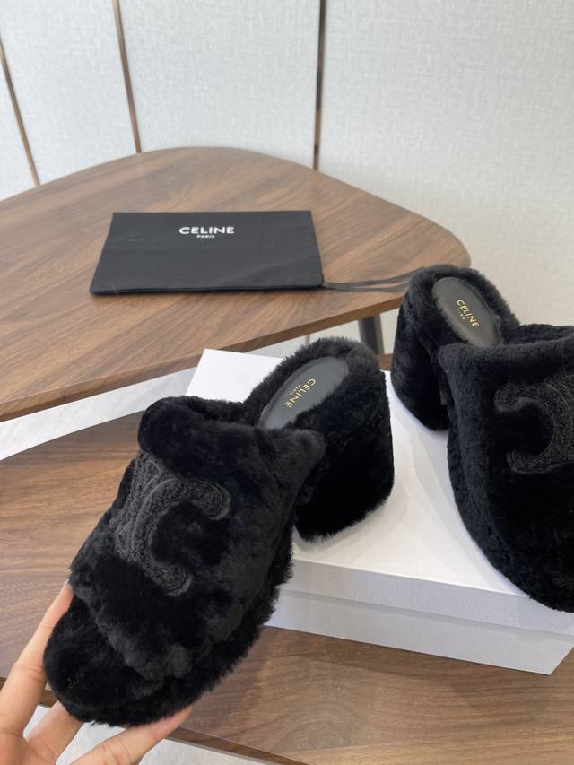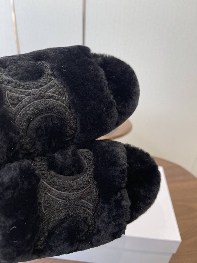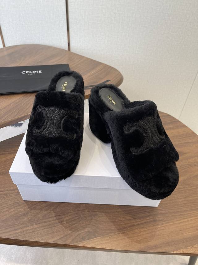 Celine 25Wf Arc de Triomphe Platform High-Heeled Fleece Slippers DDD Step into the world of Celine fleece slippers and encounter a meeting of comfort and luxury. DDD Its unique design cleverly blends the brand's classic style with cutting-edge fashion. The iconic Arc de Triomphe is exquisitely crafted onto the upper. DDD A striking and flamboyant golden luster shines on the fabric, telling the story of Celine's profound heritage and trendsetting attitude. DDD The perfect combination of a 2cm platform and an 8cm heel is not only a secret weapon but also a powerful source of presence. The thick platform cleverly distributes pressure, making walking easier and more comfortable even after long periods of wear. The heel adds an elegant rhythm to every step, showcasing feminine charm with every gesture. DDD The rubber outsole has a clear texture and strong grip, allowing you to walk steadily on both smooth and wet surfaces without fear of road conditions. The main body of the shoe is gently wrapped in soft fleece. DDD Like the warm sun in winter, every step is surrounded by warmth, gently conforming to your feet and driving away the cold. Its versatility makes it irresistible. Pair it with a simple dress for an instant elegant look, perfect for evening events and parties, making you the center of attention. Switch to jeans and a trendy top for a casual street style vibe. Perfect for going out, shopping, or just looking effortlessly chic. Made with custom-made Australian imported wool, featuring a custom-molded, non-slip outsole. Sizes: 35-39, 40, 41 (custom sizes available).