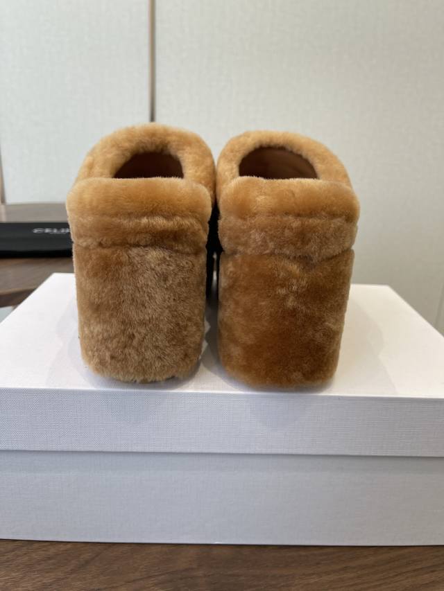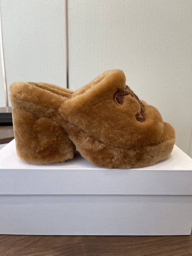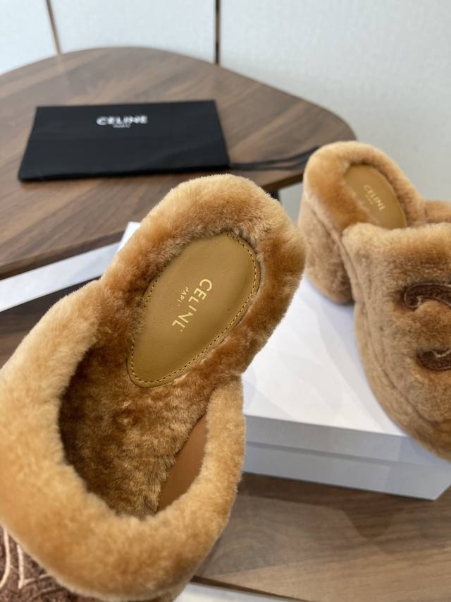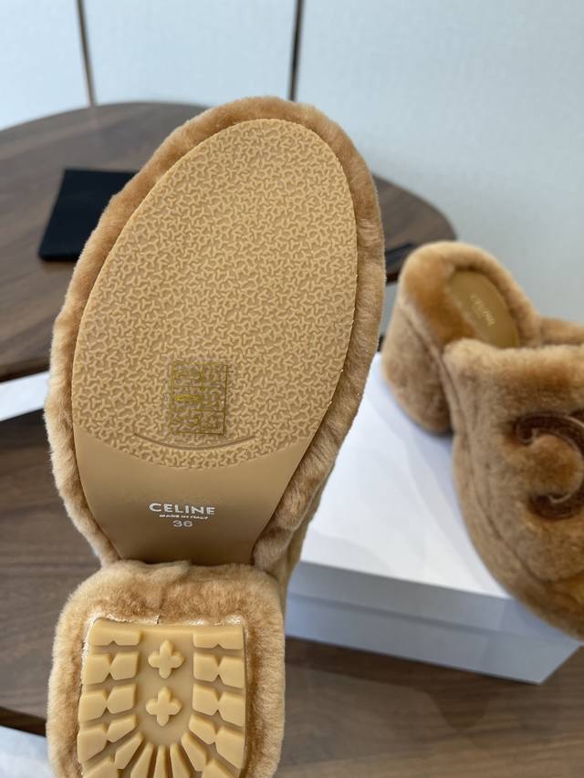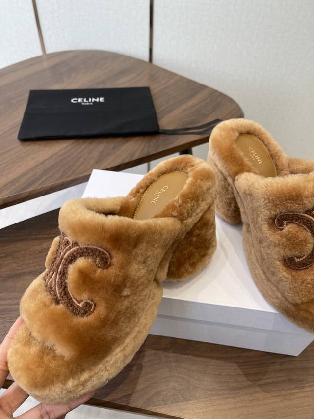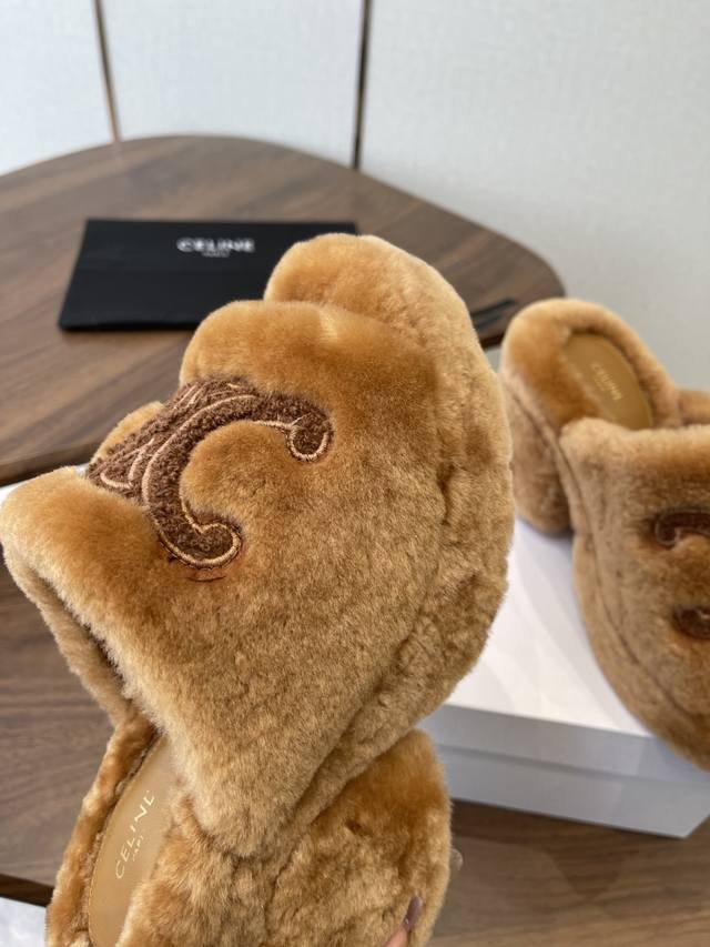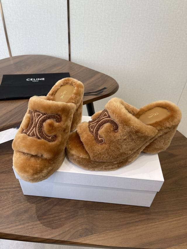 Celine 25Wf Arc de Triomphe Platform High-Heeled Fleece Slippers DDD Step into the world of Celine fleece slippers and encounter a meeting of comfort and luxury. DDD Its unique design cleverly blends the brand's classic style with cutting-edge fashion. The iconic Arc de Triomphe is exquisitely crafted onto the upper. DDD A striking and flamboyant golden luster shines on the fabric, telling the story of Celine's profound heritage and trendsetting attitude. DDD The perfect combination of a 2cm platform and an 8cm heel is not only a secret weapon but also a powerful source of presence. The thick platform cleverly distributes pressure, making walking easier and more comfortable even after long periods of wear. The heel adds an elegant rhythm to every step, showcasing feminine charm with every gesture. DDD The rubber outsole has a clear texture and strong grip, allowing you to walk steadily on both smooth and wet surfaces without fear of road conditions. The main body of the shoe is gently wrapped in soft fleece. DDD Like the warm sun in winter, every step is surrounded by warmth, gently conforming to your feet and driving away the cold. Its versatility makes it irresistible. Pair it with a simple dress for an instant elegant look, perfect for evening events and parties, making you the center of attention. Switch to jeans and a trendy top for a casual street style vibe. Perfect for going out, shopping, or just looking effortlessly chic. Made with custom-made Australian imported wool, featuring a custom-molded, non-slip outsole. Sizes: 35-39, 40, 41 (custom sizes available).