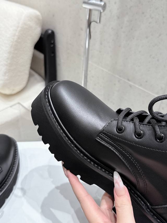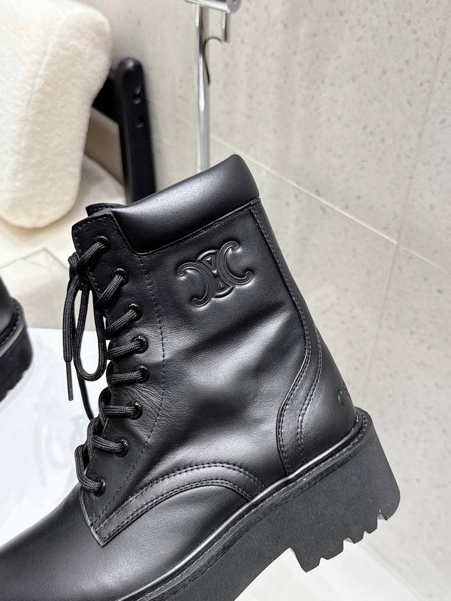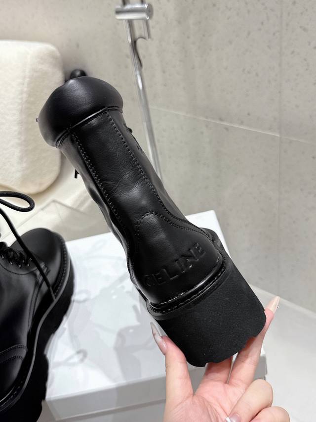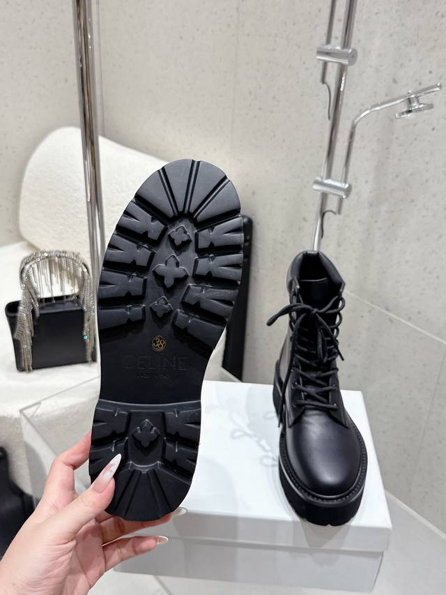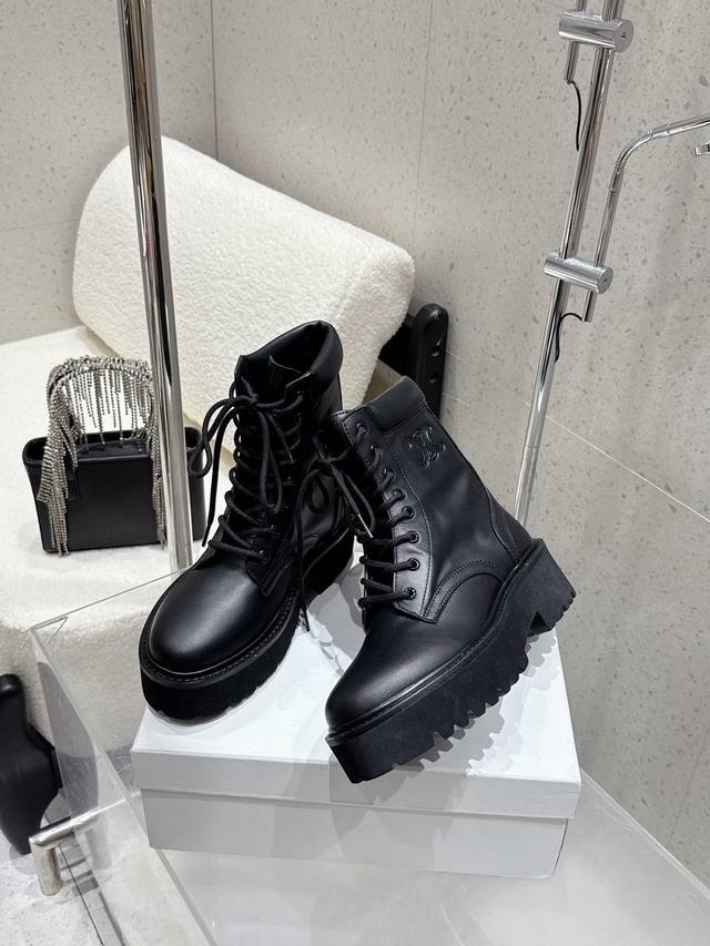 Celine Genuine Leather Platform Dr. Martens Boots with Lace-up Design | A Dual Taste of Classic and High-Quality Style DDD The black version boasts a full leather texture with a distinctive Triomphe embossing, and the platform sole adds a cool and elongating effect; the caramel brown version features a retro and eye-catching color-blocking design, and the delicate leather feels luxurious. Whether paired with streetwear or French style, it effortlessly creates a sophisticated look, making it a must-have item in your fall/winter shoe collection~ DDD Sole thickness: 4.5cm DDD True to size: 35-42 DDD