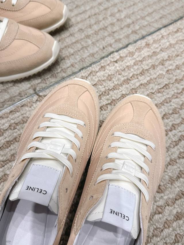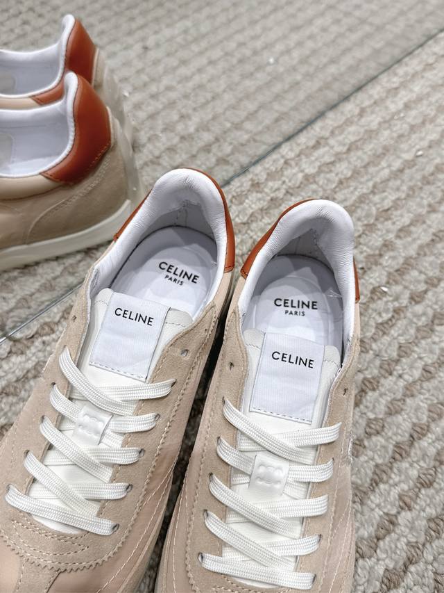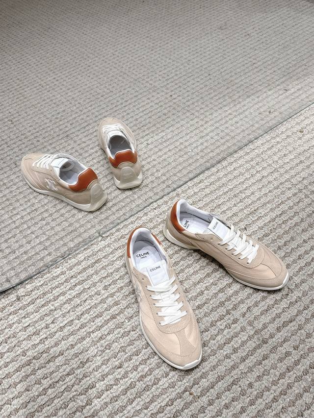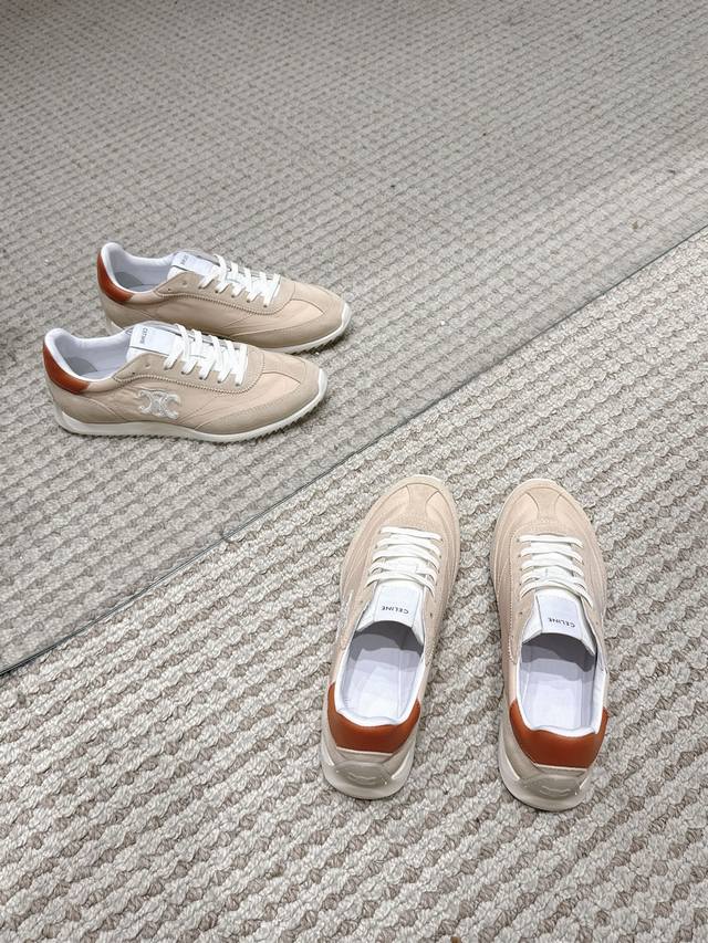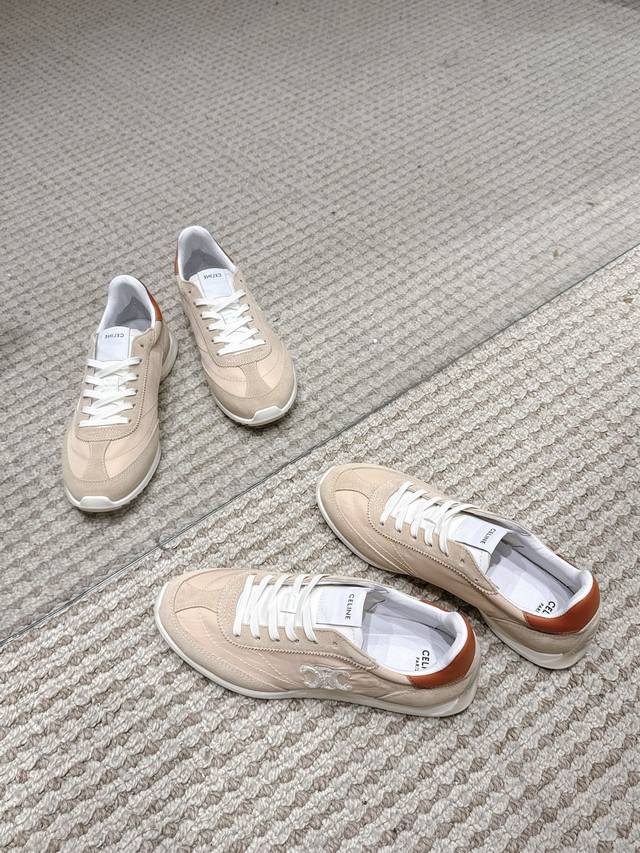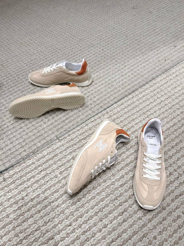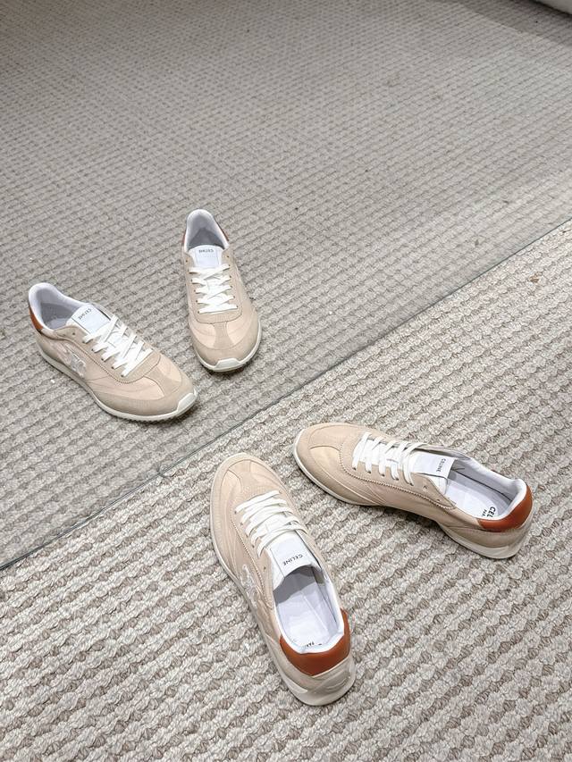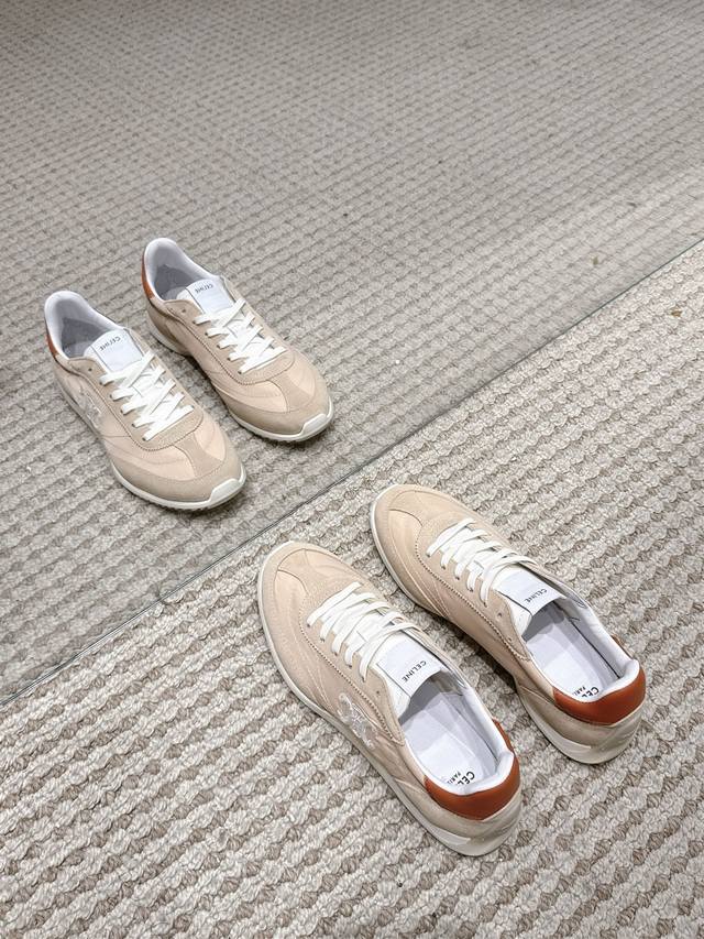 Celine presents the new "Racer" sneaker to enrich its footwear collection. Inspired by 70s athletic aesthetics, this sneaker prioritizes lightness and comfort, cleverly blending nylon, suede, and leather. The classic "Triomphe" logo is clearly visible, embroidered on the side and embossed on the heel. Offering vibrant color combinations, this sneaker further enhances its retro silhouette. Its unisex design is versatile and practical, maintaining the brand's unique style while showcasing elegance and sporty flair. Features include a high-density embroidered logo, original high-gloss suede leather, and a custom-molded outsole. Women's sizes: 35-41 DDD