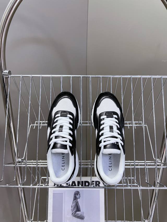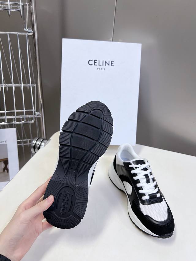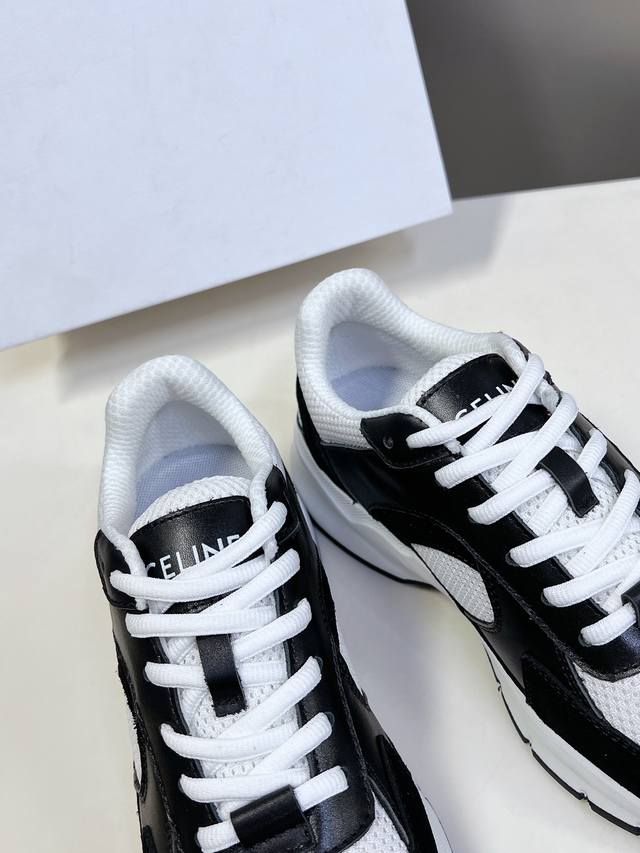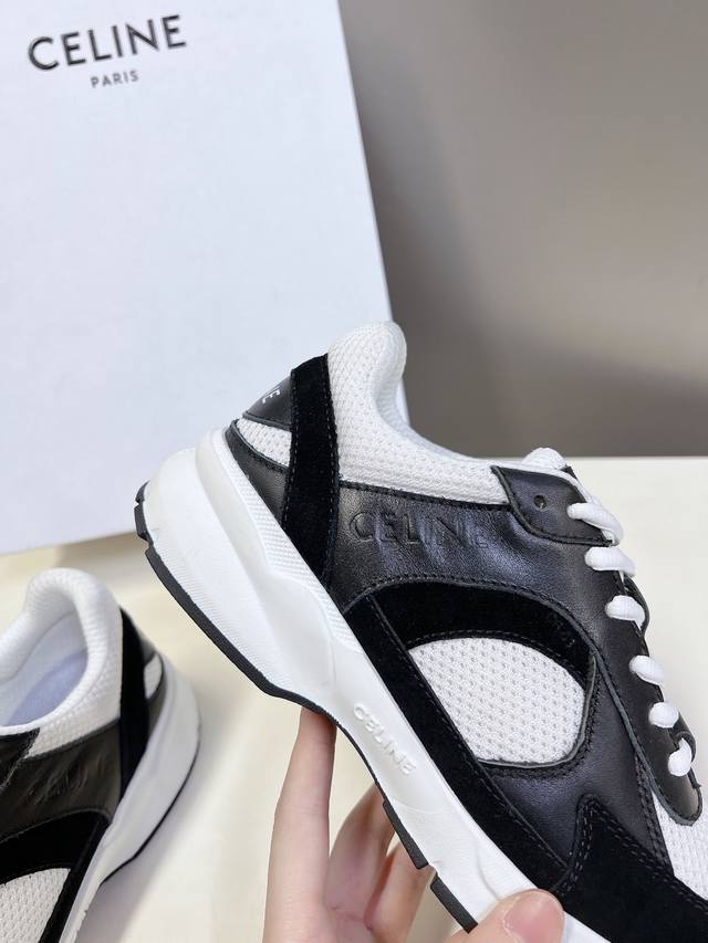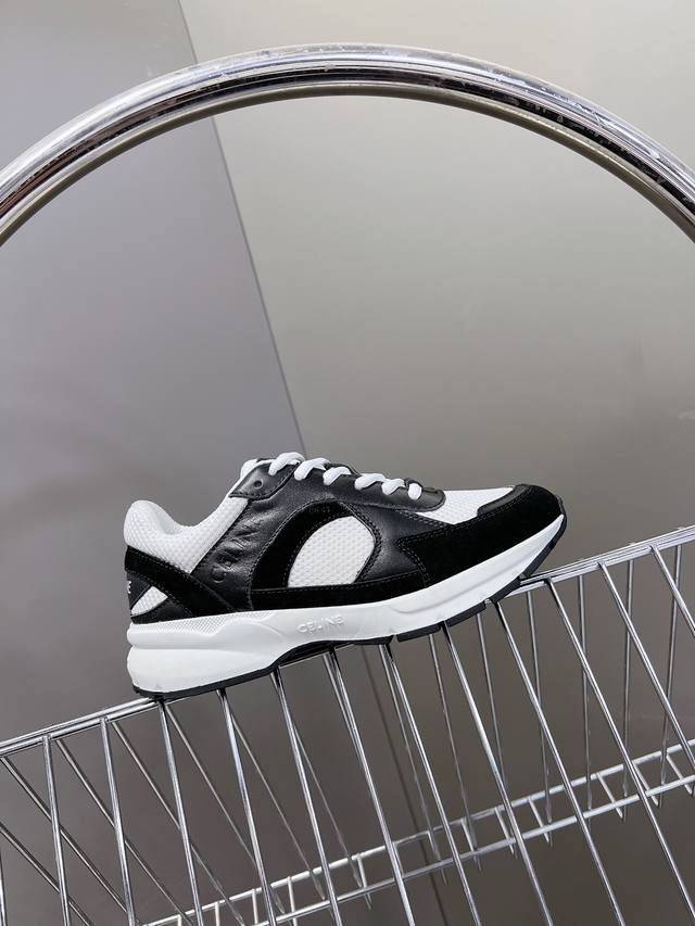 Celine Spring/Summer Runner Sneakers Runner Cr-03. The tongue and heel are adorned with the Celine logo. The sides feature an embossed Cr-03 design. The heel and sides also feature an embossed Arc de Triomphe logo. The lace-up design is simple, comfortable, clean, and flattering, making legs appear slimmer and longer. Whether worn alone or paired with wide-leg pants, it's a high-street yet retro look. Become a Celine girl! Upper: Original nubuck leather; Lining: Original lining; Outsole: TPU material; Size: 35-40.