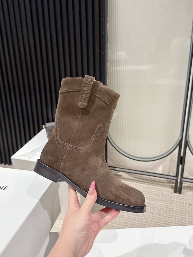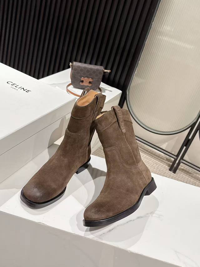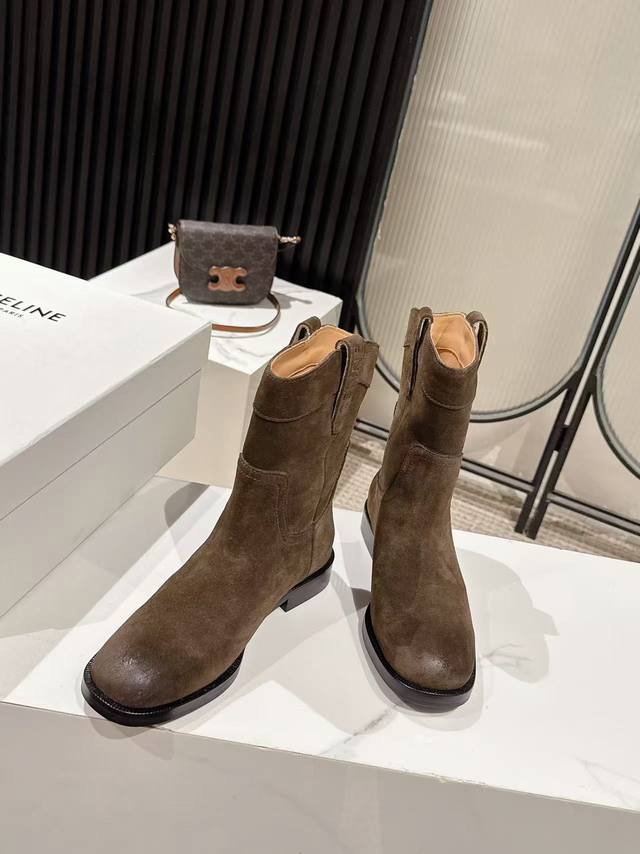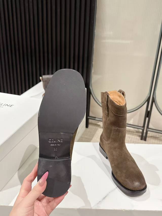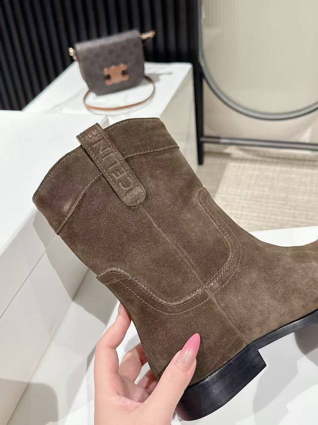 Celine's latest Fall/Winter runway style, Lisa's same style Western cowboy ankle boots. Many celebrities and influencers wear them; incredibly slimming and stylish, versatile. Imported Italian calfskin, soft suede, original custom material, 3cm heel height, makes legs look slimmer, cowhide lining, Italian genuine leather outsole, full packaging. Size: 35~41