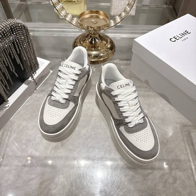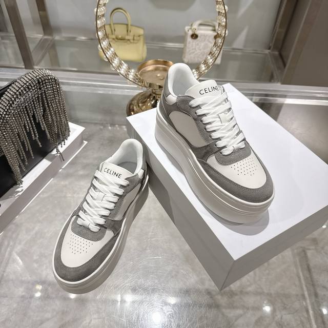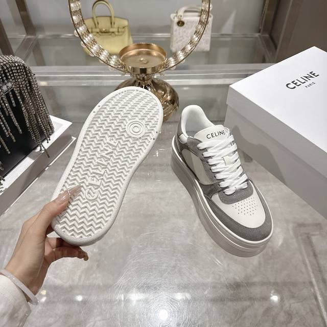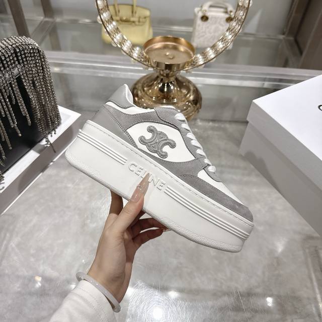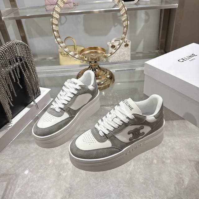 Factory direct. 2026 Spring New Arrival Celine Block Triomphe Sneakers. Made of cowhide leather, these platform sneakers feature a thick sole and Celine logo embossed on the back and sides. Simple, comfortable, and clean-cut, they add height and make legs appear slimmer. Whether worn alone or paired with wide-leg pants, they offer a high-street yet retro look. Sizes: 35-41.