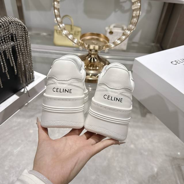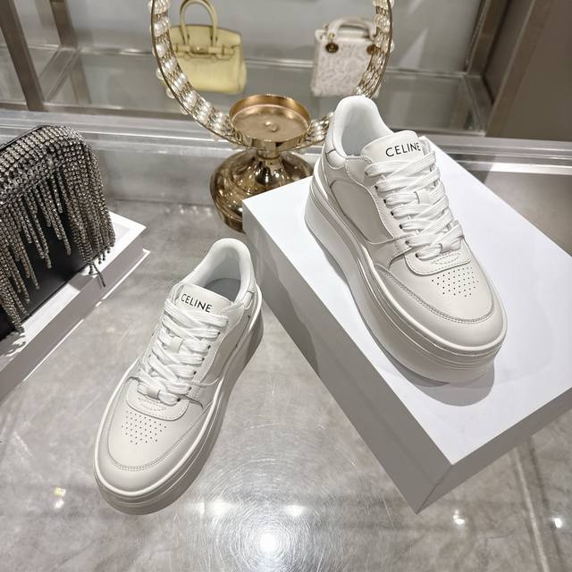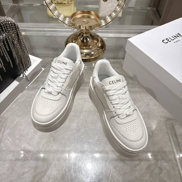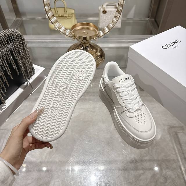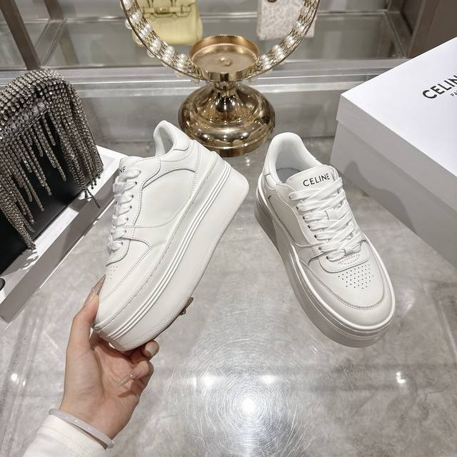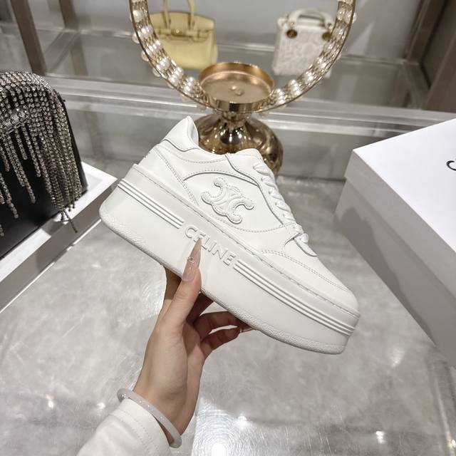 Factory direct. 2026 Spring New Arrival Celine Block Triomphe Sneakers. Made of cowhide leather, these platform sneakers feature a thick sole and Celine logo embossed on the back and sides. Simple, comfortable, and clean-cut, they add height and make legs appear slimmer. Whether worn alone or paired with wide-leg pants, they offer a high-street yet retro look. Sizes: 35-41.