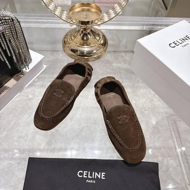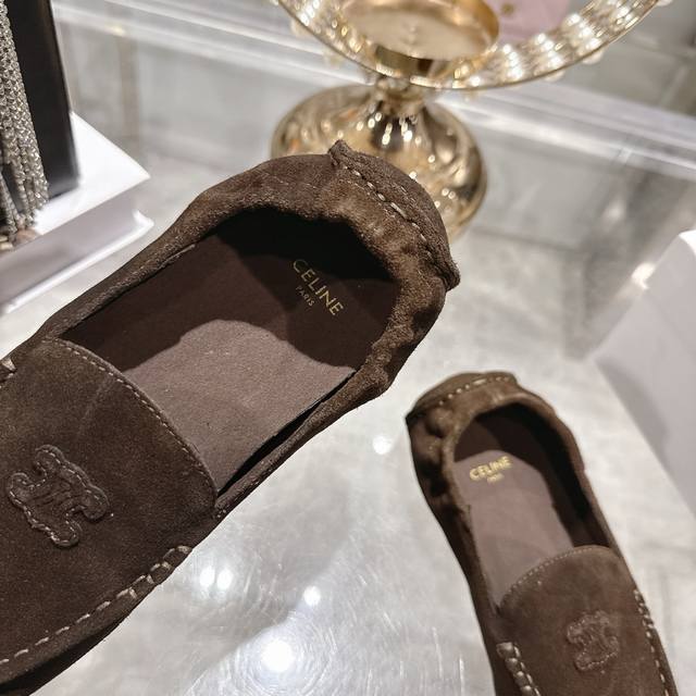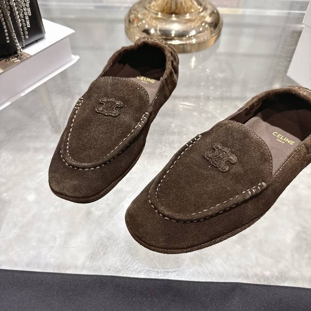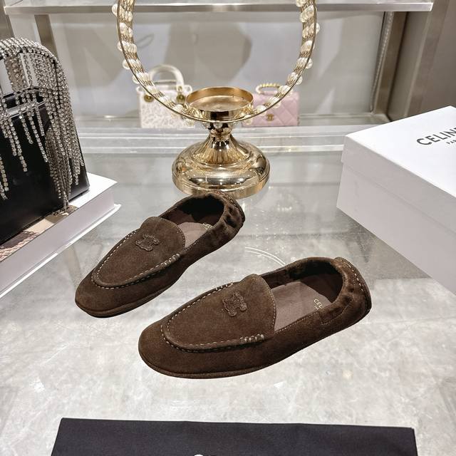 Factory direct. Celine Adam series retro boat shoes, Arc de Triomphe loafers, flat loafers with elastic back. A classic reimagined, these shoes feature a durable rubber sole for comfortable walking. The minimalist design and exquisite craftsmanship create a chic French look, unlocking a sophisticated everyday style. Perfect for casual outings, these shoes easily elevate your overall style. They fit snugly to the foot, preventing fatigue and providing breathability for spring and summer. Whether you're shopping, traveling, or exercising, these shoes are the perfect match. Upper: Custom high-gloss suede. Insole: Suede. Outsole: Original molded TPU rubber outsole. Sizes: 35-39. Size 40 is custom-made and non-refundable.