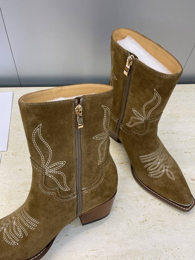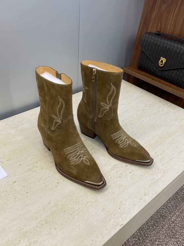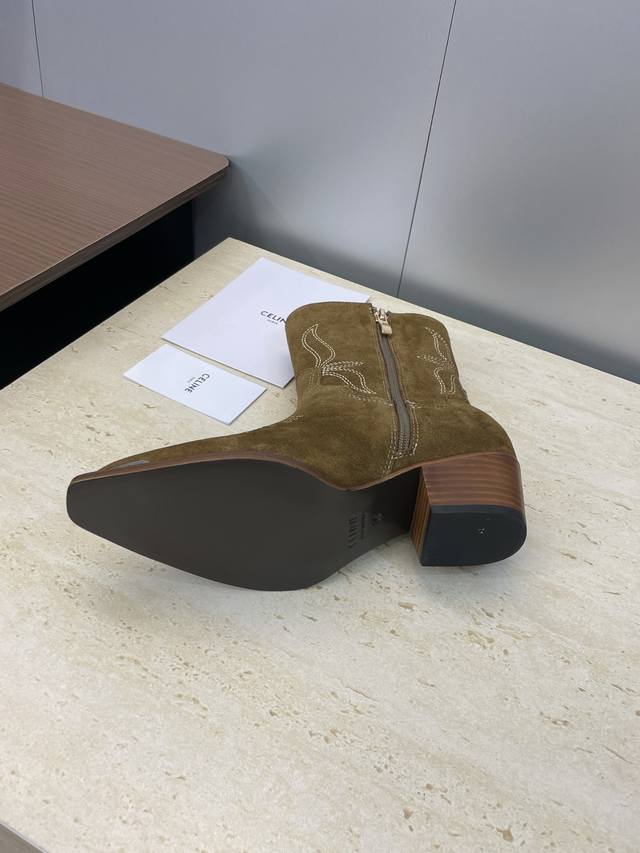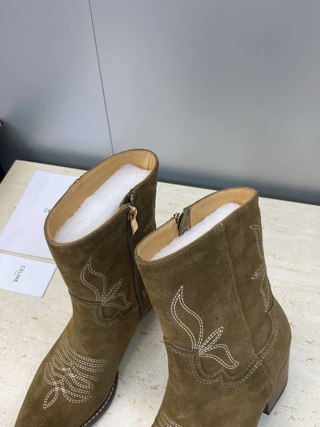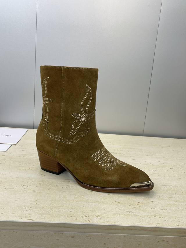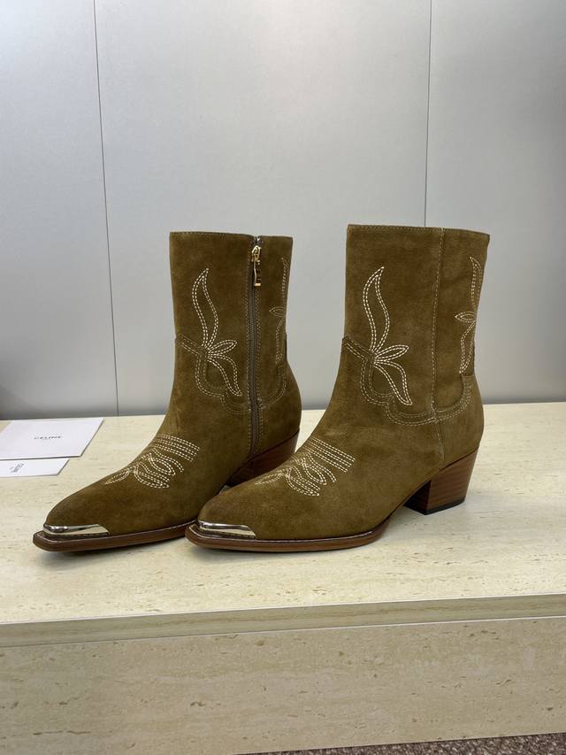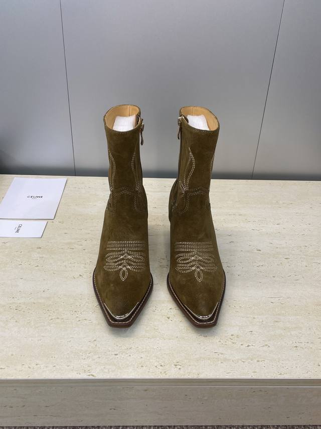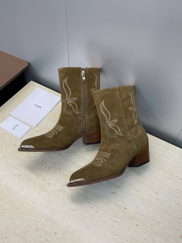 Celine 2025 Autumn/Winter New Punk Style Iron-Toe Motorcycle Embroidered Women's Ankle Boots Celine Letter Logo Hardware Buckle Chunky Heel Side Zipper Pointed Toe Rider Boots