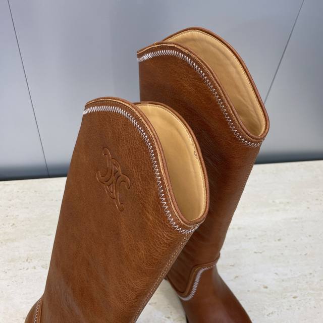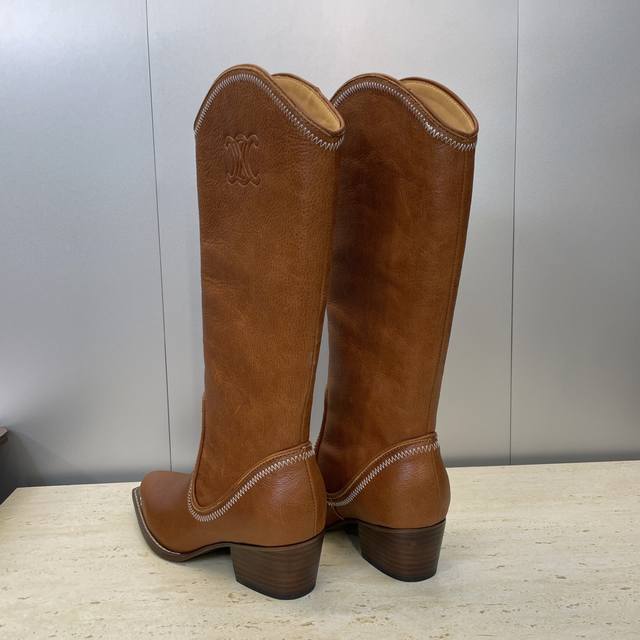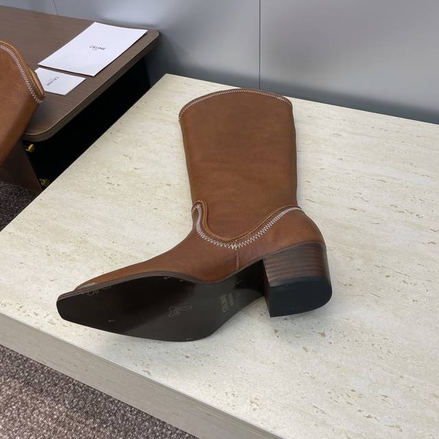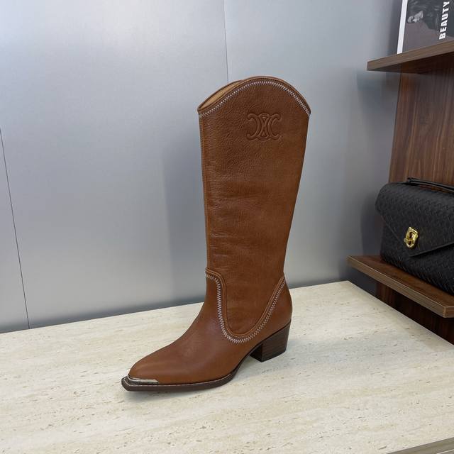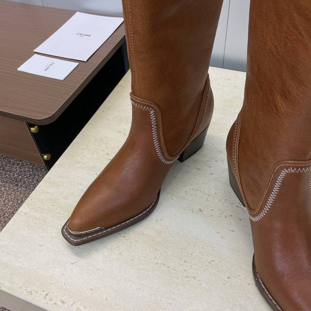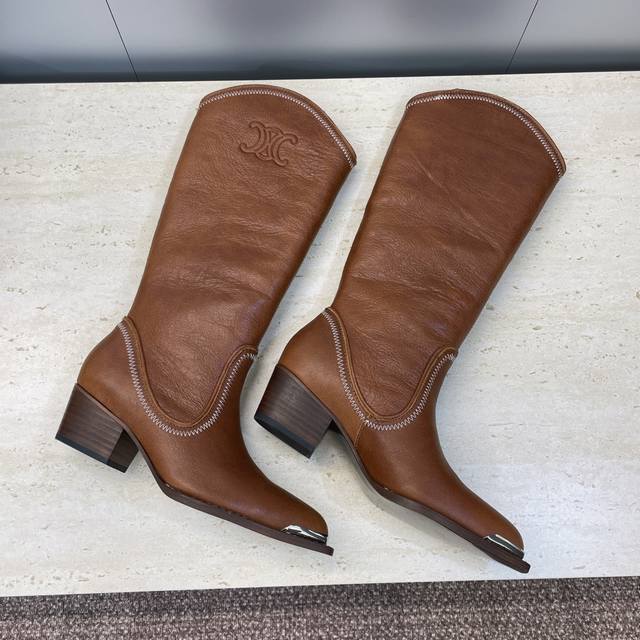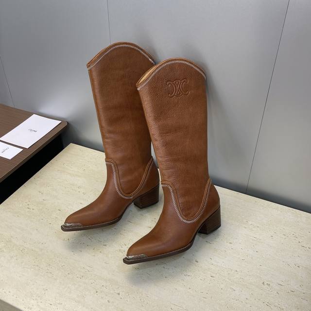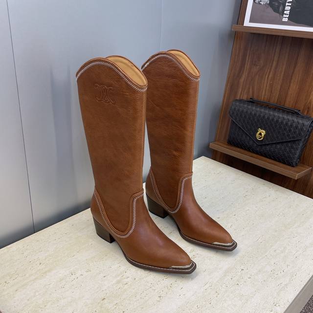 Factory Price P Leather Celine 2025 Autumn/Winter New Punk Style Iron-Toe Motorcycle Women's Long Boots Celine Letter Logo Hardware Buckle Chunky Heel Pointed Toe High-Top Knee-High Riding Boots Material: Custom imported calfskin upper, imported suede + water-dyed cowhide lining + Italian genuine leather outsole Heel height: 4.5cm Size: Women's sizes 35-41 40.41 Custom orders are non-refundable and non-exchangeable