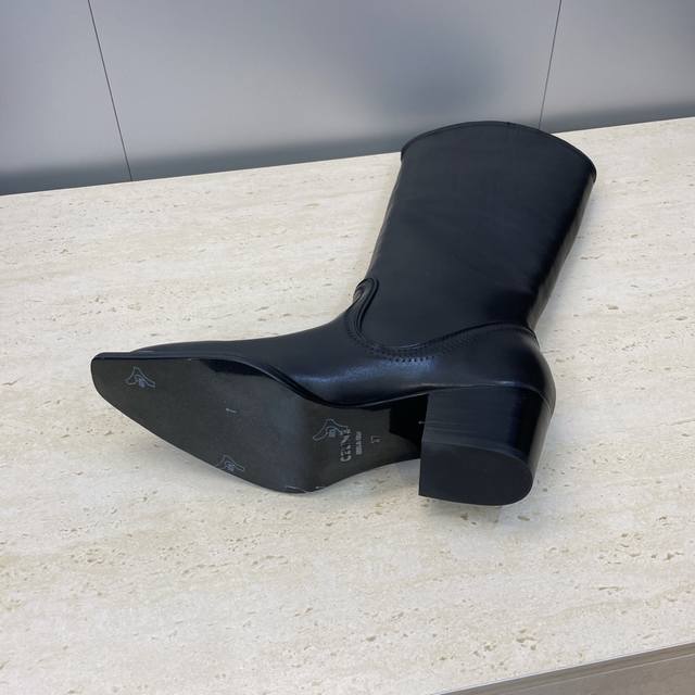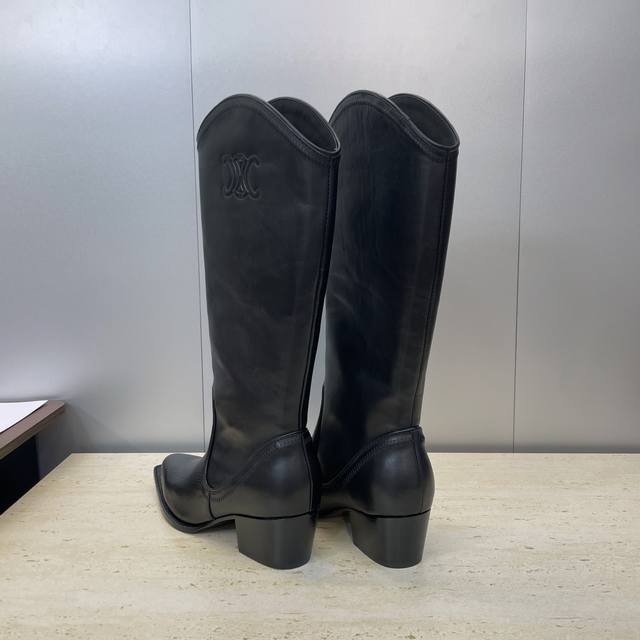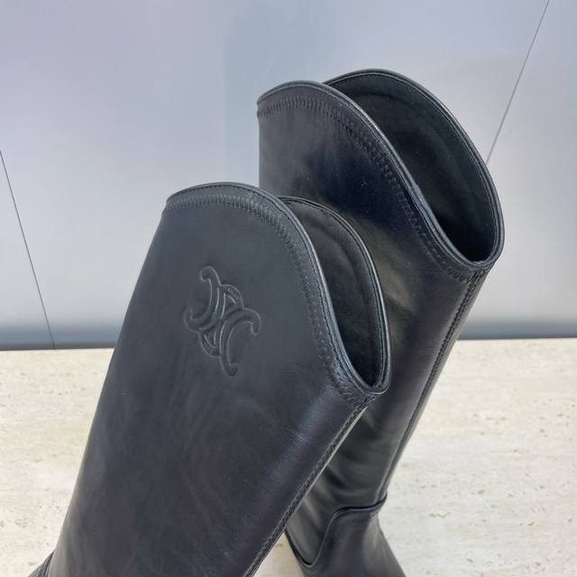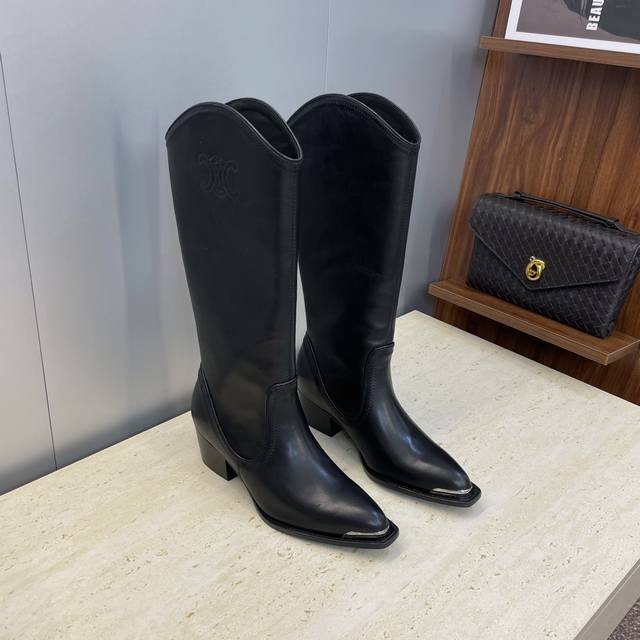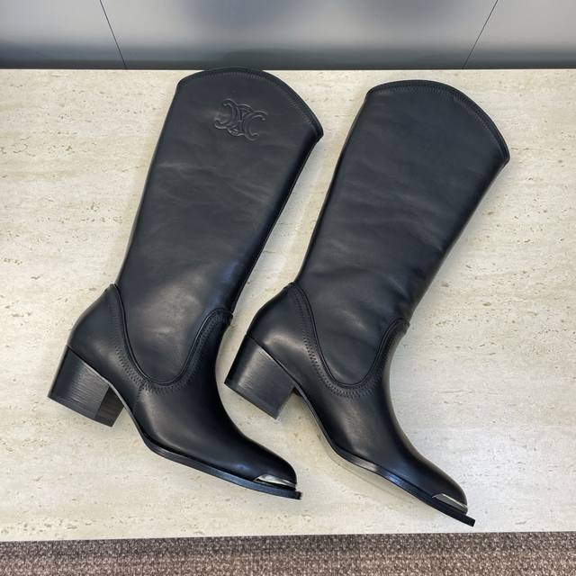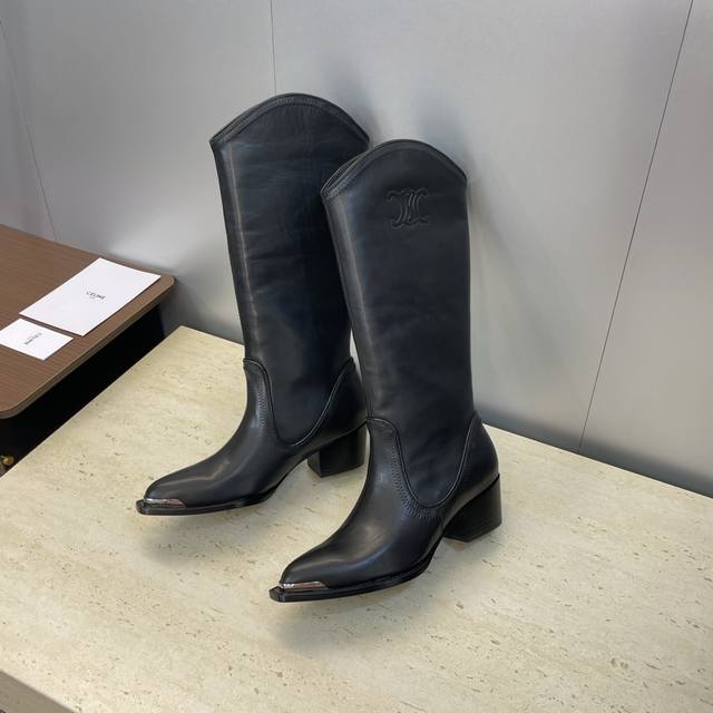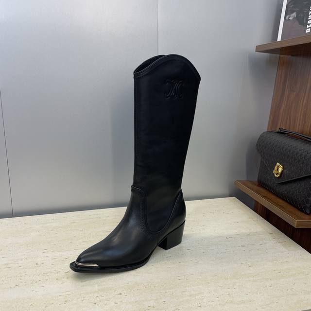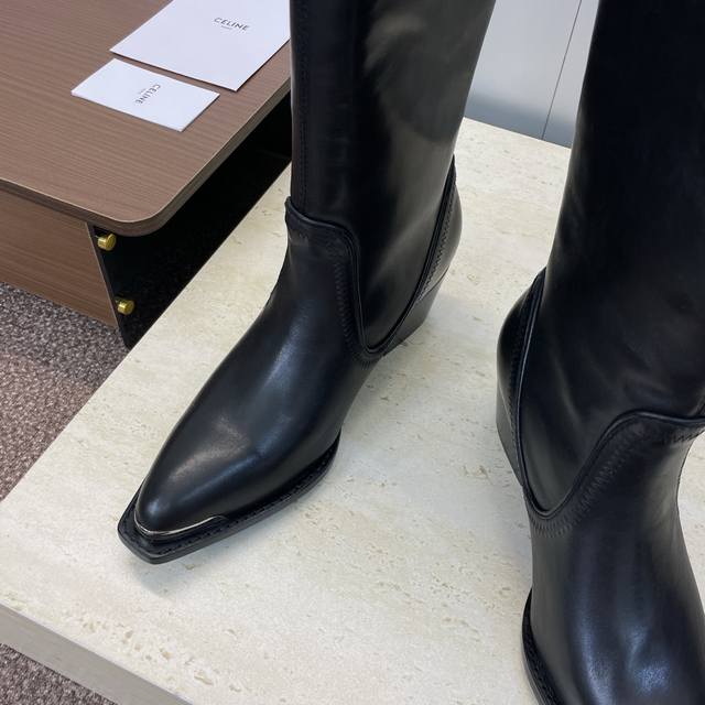 Factory Price P Leather Celine 2025 Autumn/Winter New Punk Style Iron-Toe Motorcycle Women's Long Boots Celine Letter Logo Hardware Buckle Chunky Heel Pointed Toe High-Top Knee-High Riding Boots Material: Custom imported calfskin upper, imported suede + water-dyed cowhide lining + Italian genuine leather outsole Heel height: 4.5cm Size: Women's sizes 35-41 40.41 Custom orders are non-refundable and non-exchangeable