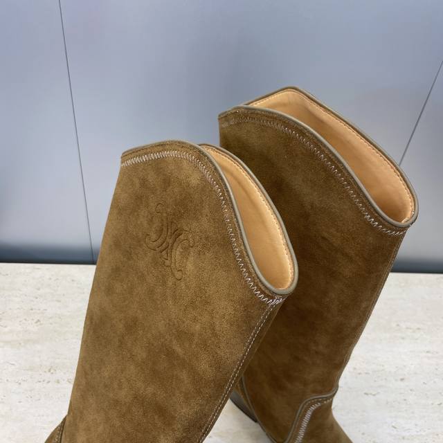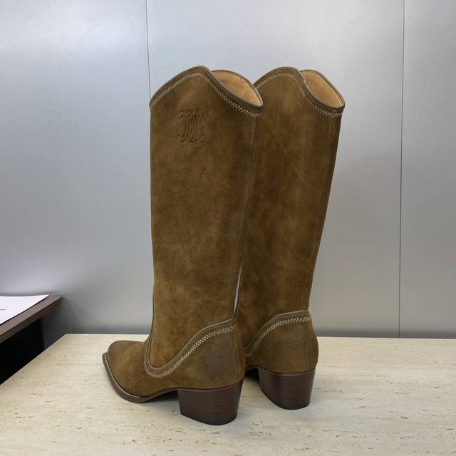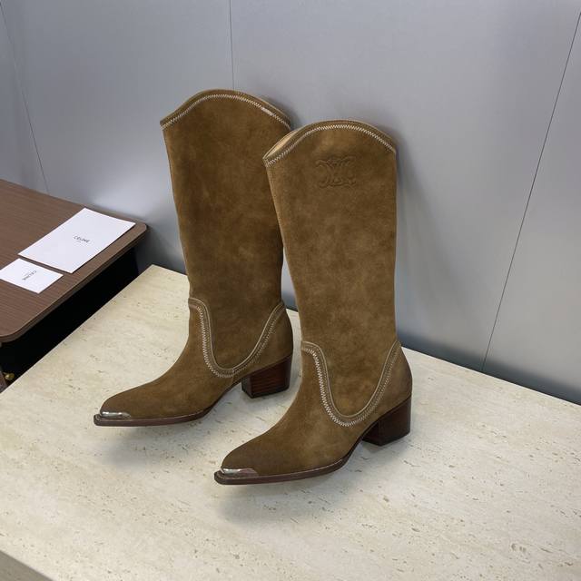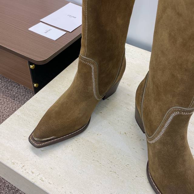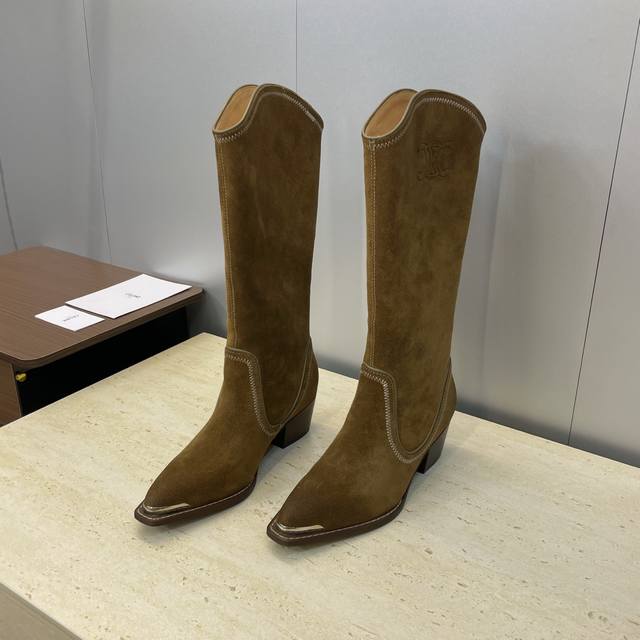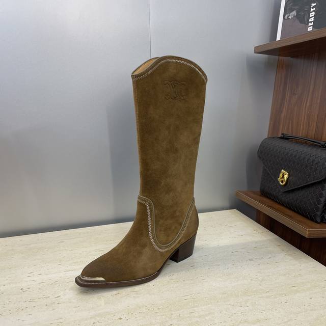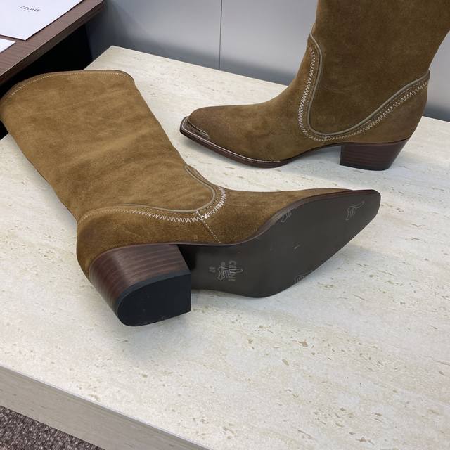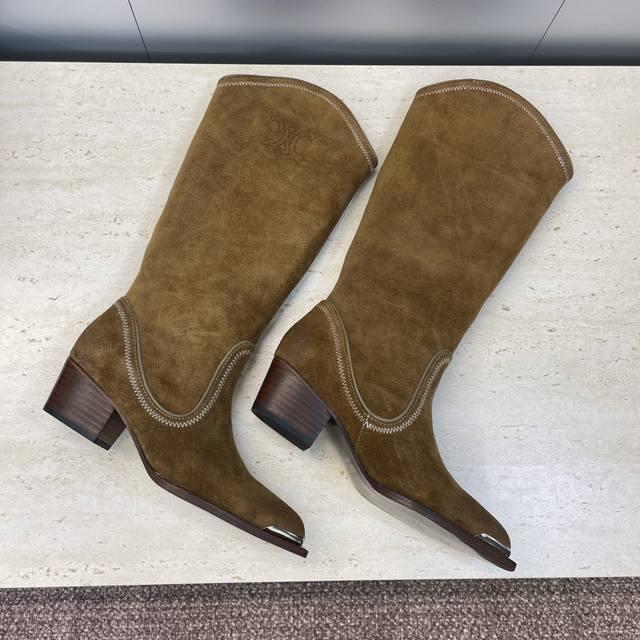 Factory Price P Leather Celine 2025 Autumn/Winter New Punk Style Iron-Toe Motorcycle Women's Long Boots Celine Letter Logo Hardware Buckle Chunky Heel Pointed Toe High-Top Knee-High Riding Boots Material: Custom imported calfskin upper, imported suede + water-dyed cowhide lining + Italian genuine leather outsole Heel height: 4.5cm Size: Women's sizes 35-41 40.41 Custom orders are non-refundable and non-exchangeable