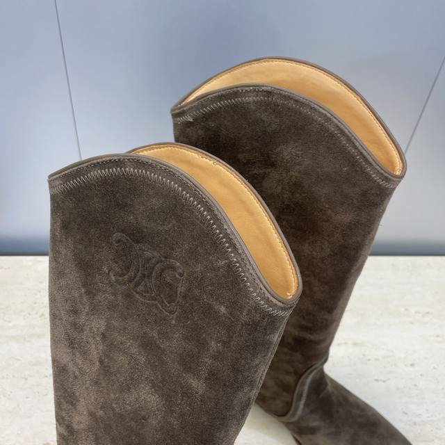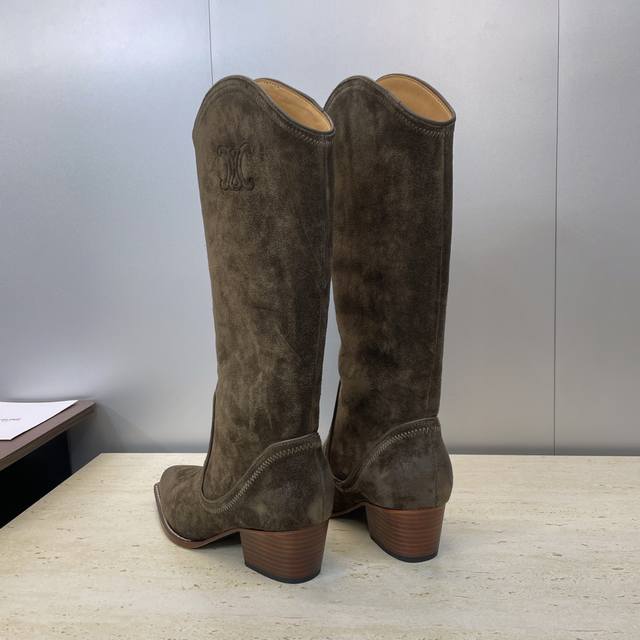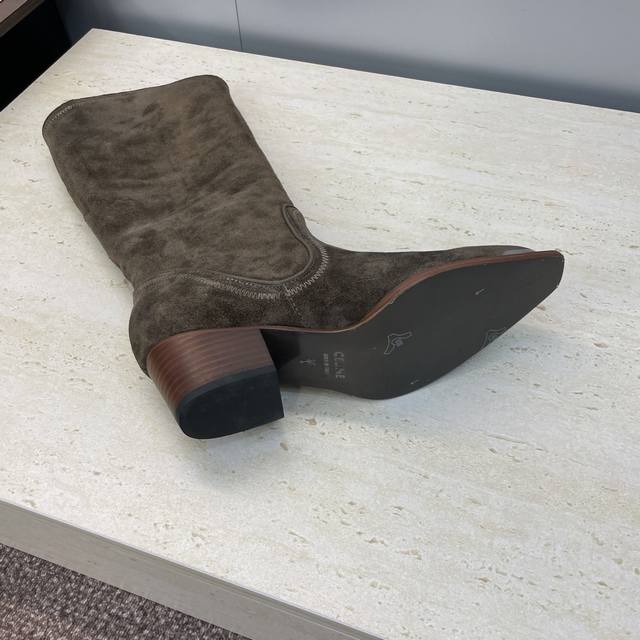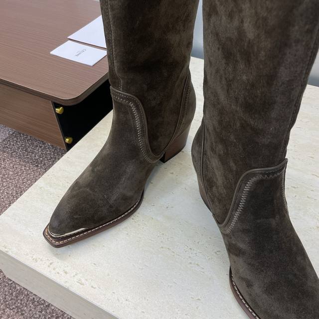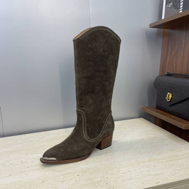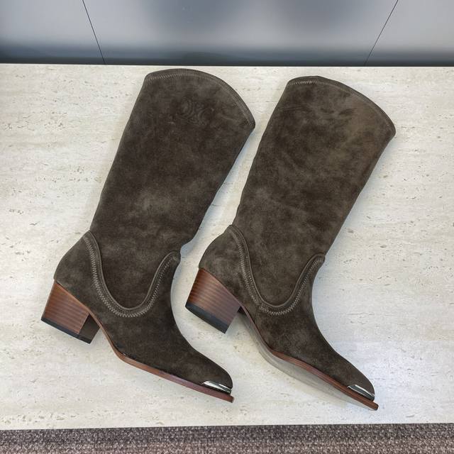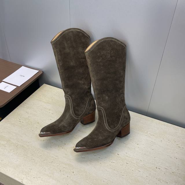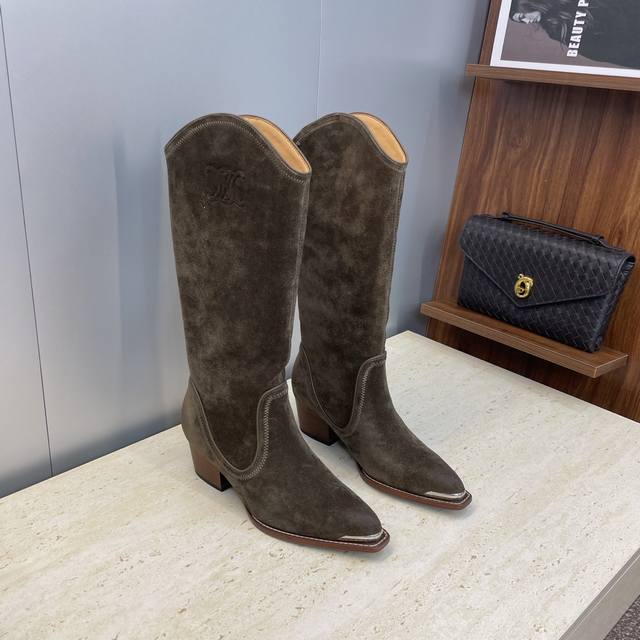 Factory Price P Leather Celine 2025 Autumn/Winter New Punk Style Iron-Toe Motorcycle Women's Long Boots Celine Letter Logo Hardware Buckle Chunky Heel Pointed Toe High-Top Knee-High Riding Boots Material: Custom imported calfskin upper, imported suede + water-dyed cowhide lining + Italian genuine leather outsole Heel height: 4.5cm Size: Women's sizes 35-41 40.41 Custom orders are non-refundable and non-exchangeable