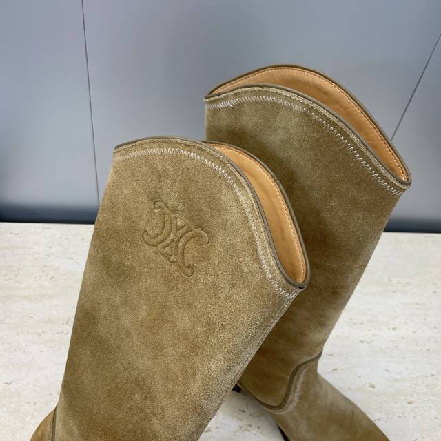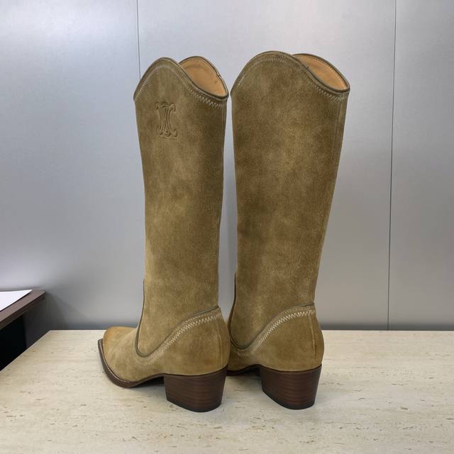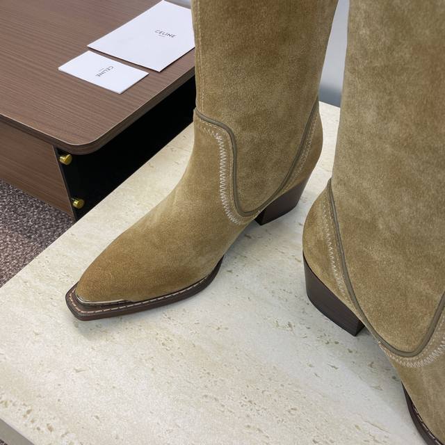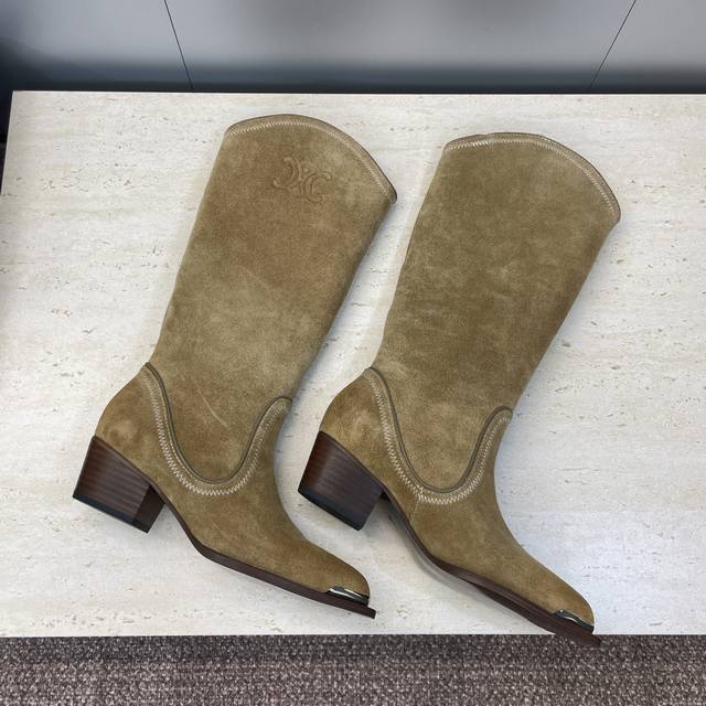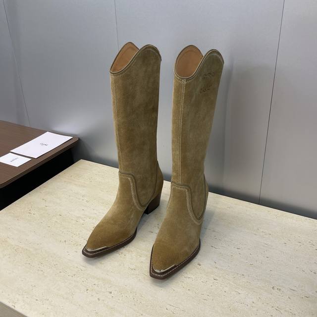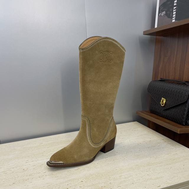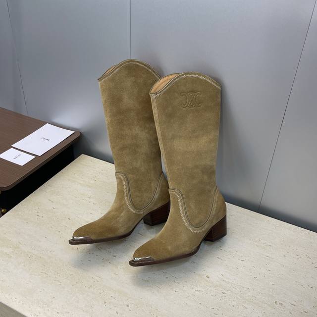 Factory Price P Leather Celine 2025 Autumn/Winter New Punk Style Iron-Toe Motorcycle Women's Long Boots Celine Letter Logo Hardware Buckle Chunky Heel Pointed Toe High-Top Knee-High Riding Boots Material: Custom imported calfskin upper, imported suede + water-dyed cowhide lining + Italian genuine leather outsole Heel height: 4.5cm Size: Women's sizes 35-41 40.41 Custom orders are non-refundable and non-exchangeable