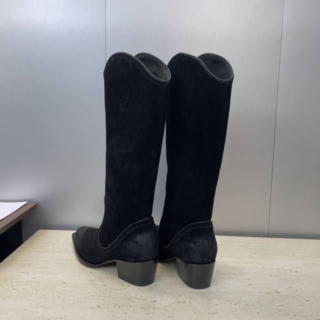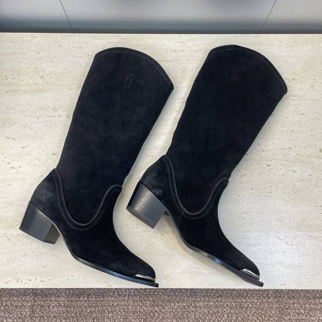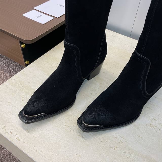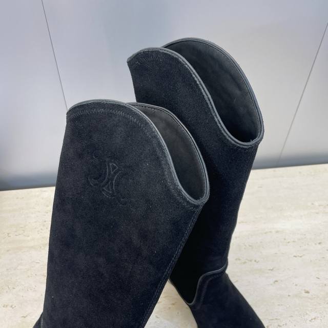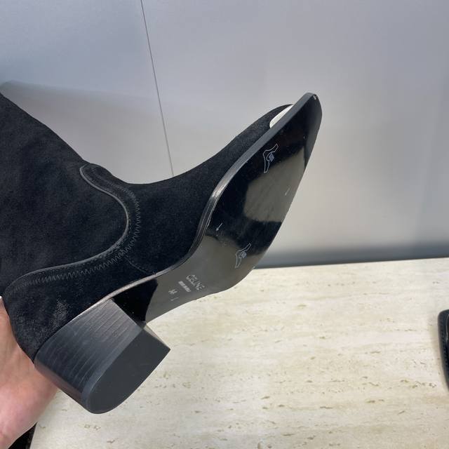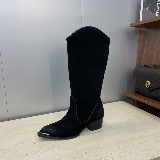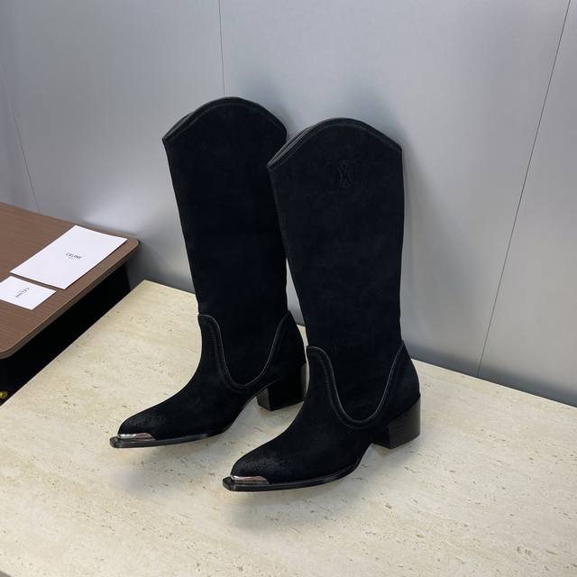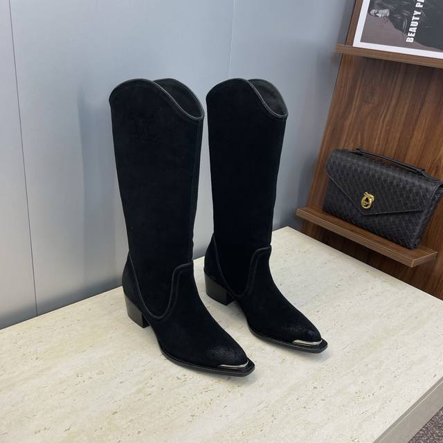 Factory Price P Leather Celine 2025 Autumn/Winter New Punk Style Iron-Toe Motorcycle Women's Long Boots Celine Letter Logo Hardware Buckle Chunky Heel Pointed Toe High-Top Knee-High Riding Boots Material: Custom imported calfskin upper, imported suede + water-dyed cowhide lining + Italian genuine leather outsole Heel height: 4.5cm Size: Women's sizes 35-41 40.41 Custom orders are non-refundable and non-exchangeable