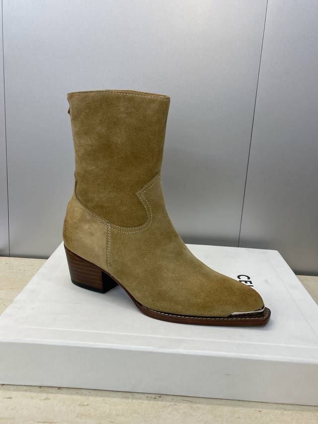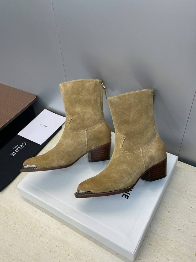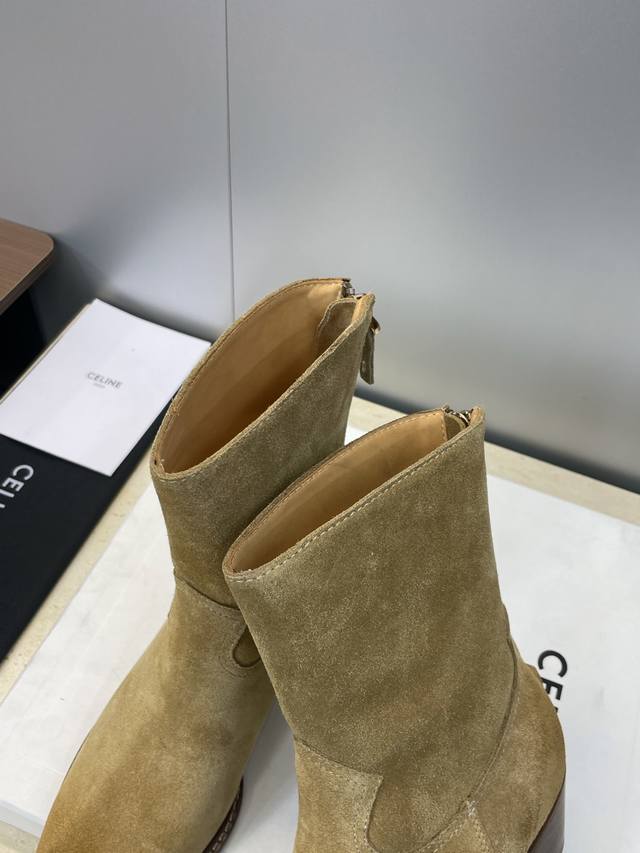 Celine 2025 Autumn/Winter New Punk Style Iron Toe Motorcycle Women's Ankle Boots Celine Letter Logo Hardware Buckle Chunky Heel Back Zipper Pointed Toe Riding Boots
