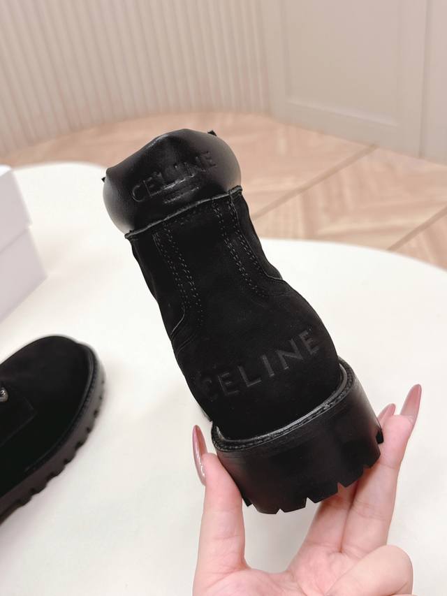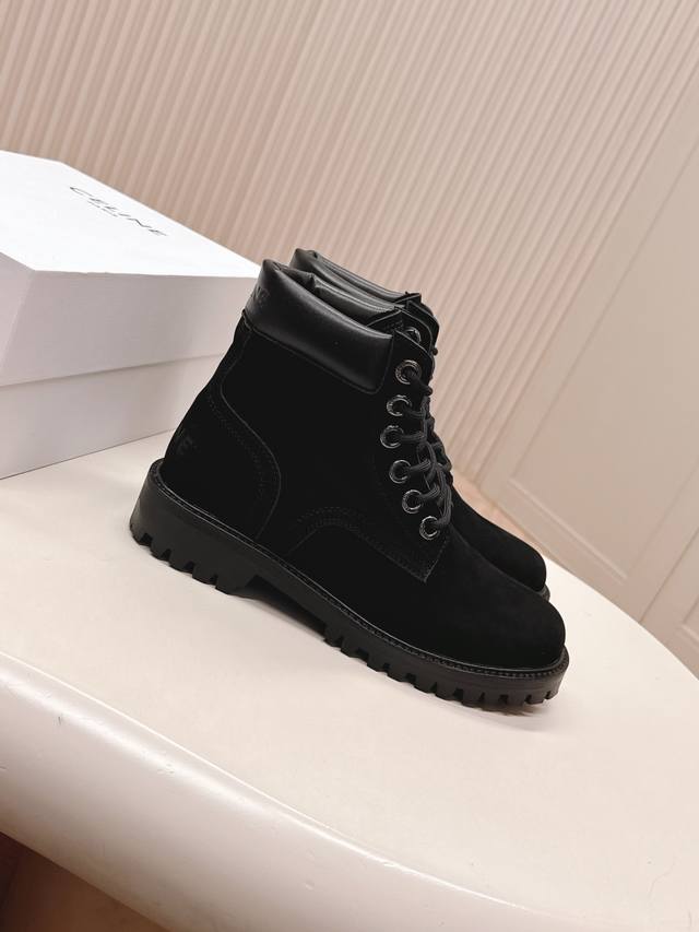 High-quality Celine classic combat boots, round toe, retro style, cool and stylish. The distressed upper is made of imported cow suede, with a super nice texture. The inner lining is cowhide, and the sole is a 1:1 replica of the original! Very comfortable to wear. The large toe design is a surefire way to increase height. Size: 35-40