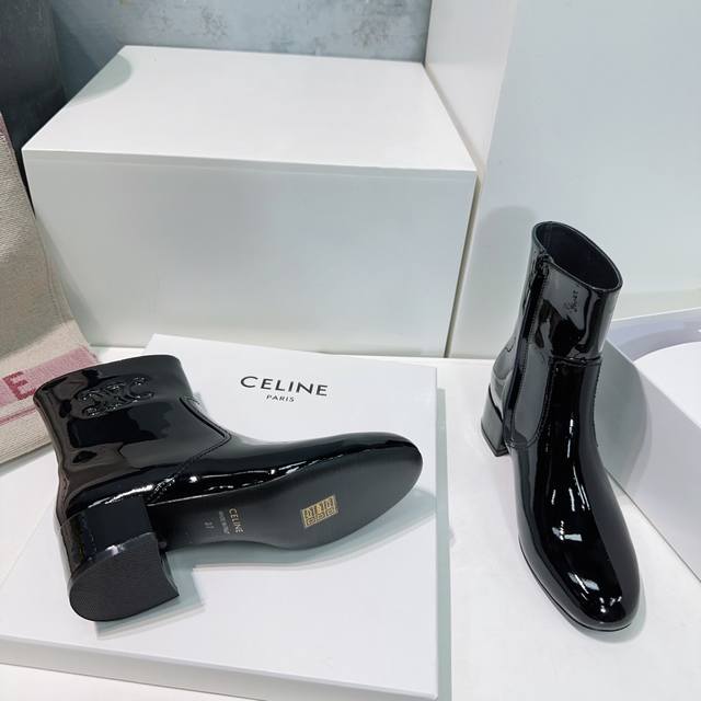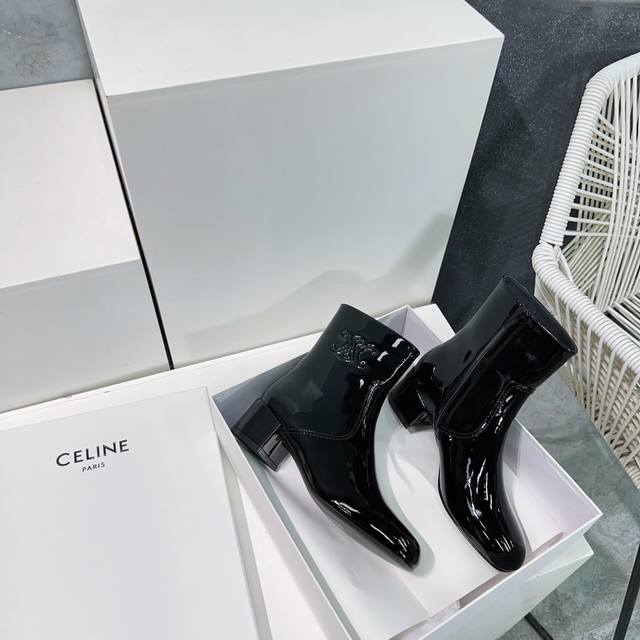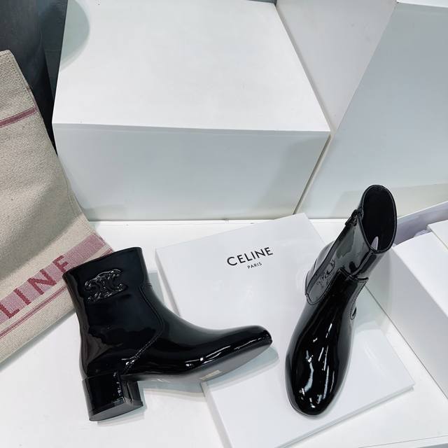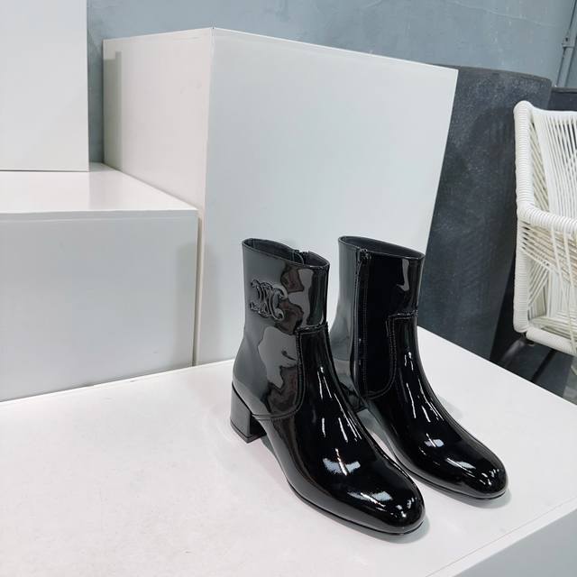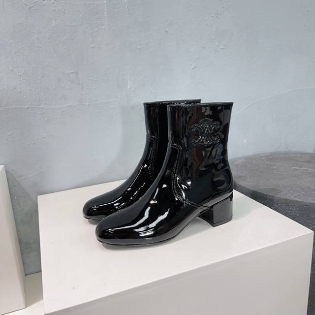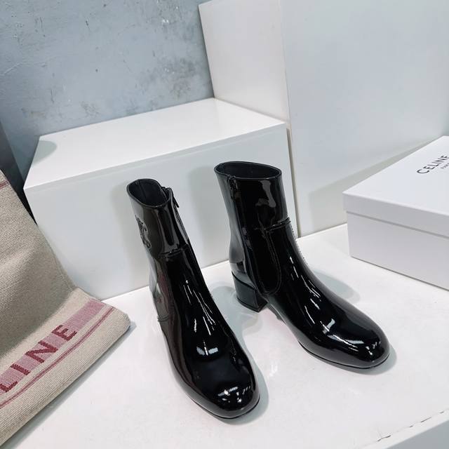 High-quality factory direct! Short! Long! Top quality Celine 25Ss Fall/Winter new arrival Arc de Triomphe retro simple patent leather chunky heel short boots long boots straight riding boots!