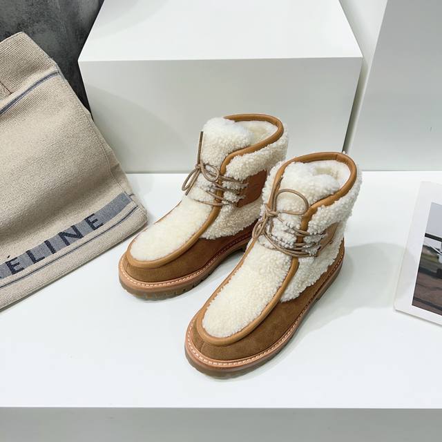 High-quality factory release! Celine 2025 Autumn/Winter latest snow boots, furry ankle boots! Lisa's super popular retro Arc de Triomphe lace-up ankle boots, Martin boots! DDD Correct version, top-tier design, understated and simple, with wool trim on the upper, cute shape with a touch of retro style, highly recognizable brand, slimming and lightweight, and the 3.5cm sole adds height while making walking easy and pressure-free. They suit everyone and can be easily paired with anything. DDD The upper is made of original cow suede and genuine wool, with a wool lining! Warm and stylish! Original mold, genuine leather trim combined with a large rubber sole! Excellent height-increasing effect. DDD Sizes: 35-40. Size 40 is custom-made and non-refundable. DDD Comes with original packaging. DDD
