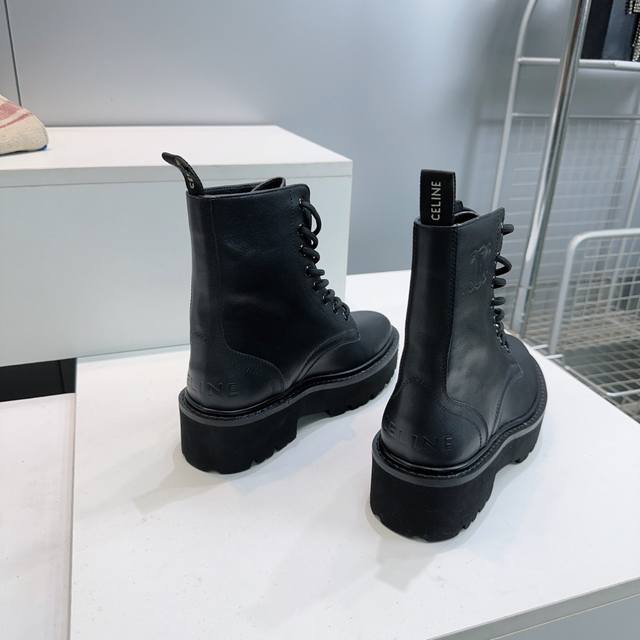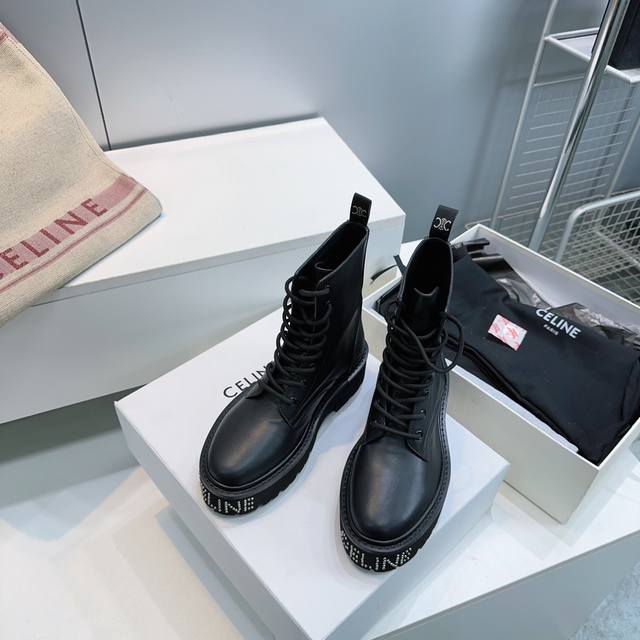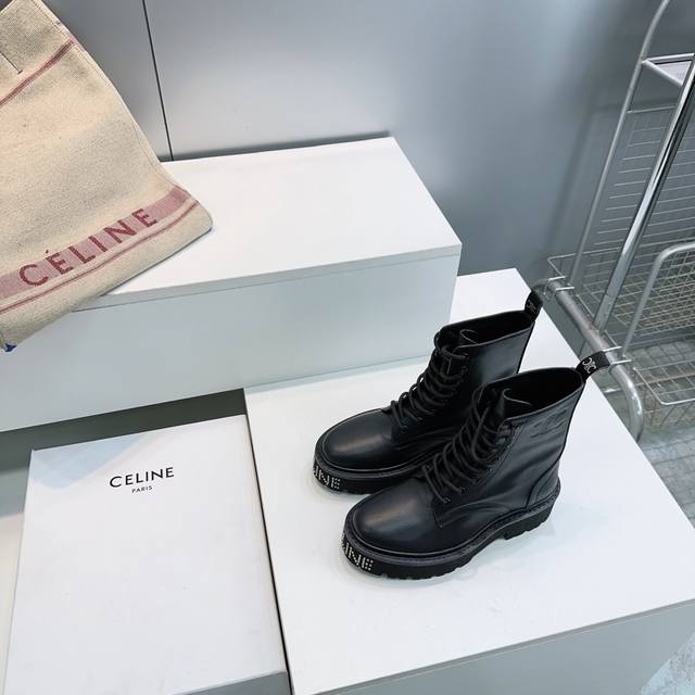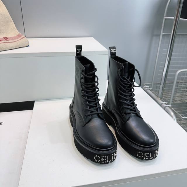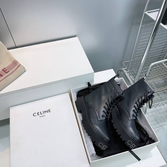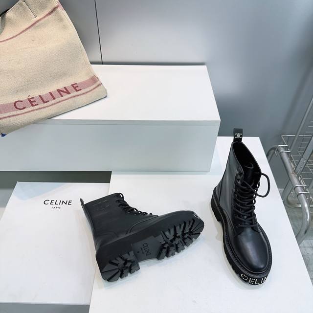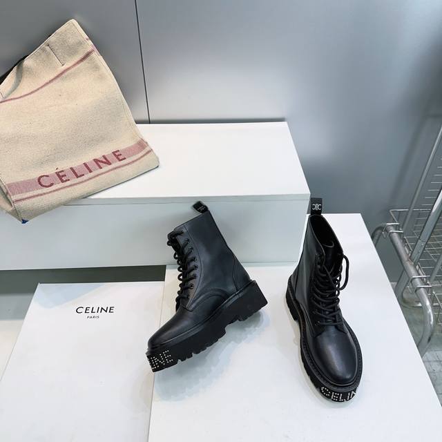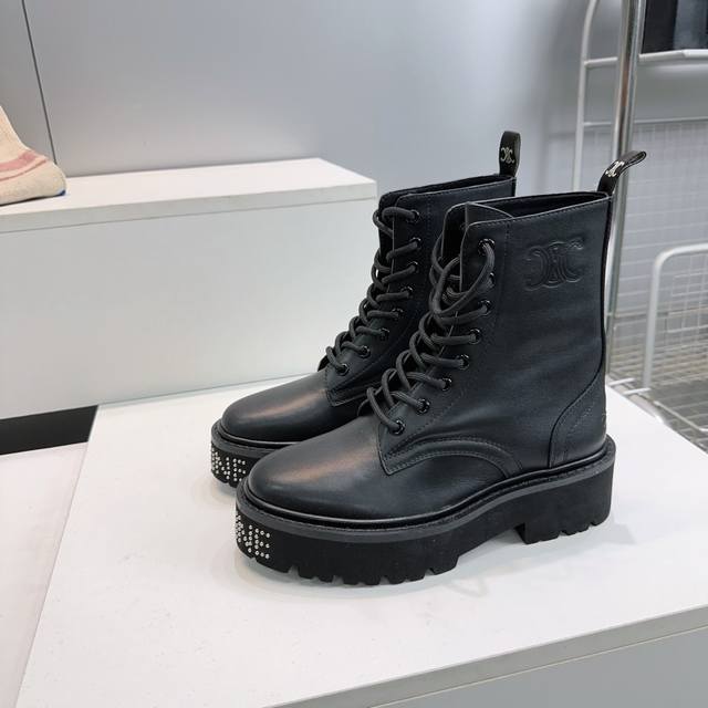 High-quality factory release! Top-quality Celine 25Ss Fall/Winter Arc de Triomphe classic new platform ankle boots with a super slimming and height-increasing design! The platform sole looks incredibly stylish and cool on the feet! The studded logo on the toe is both elegant and stylish, and it's absolutely perfect with jeans