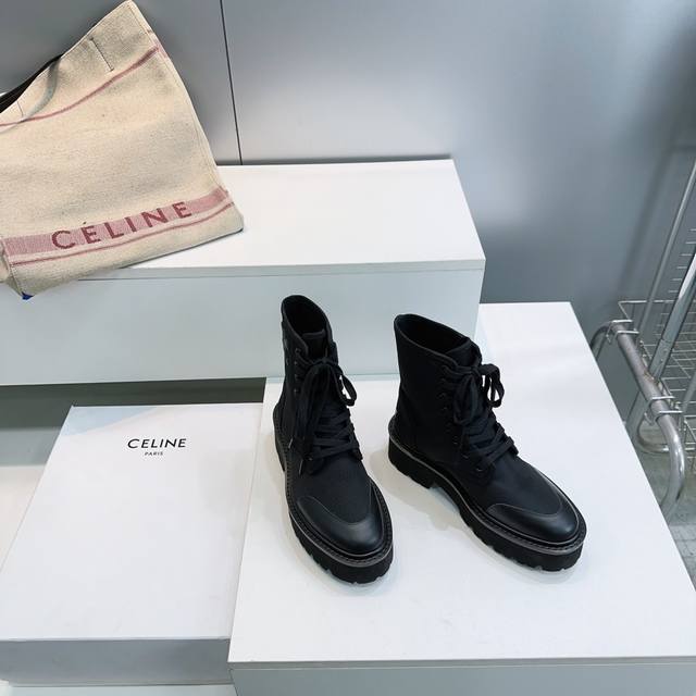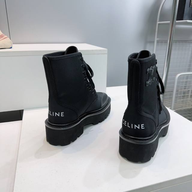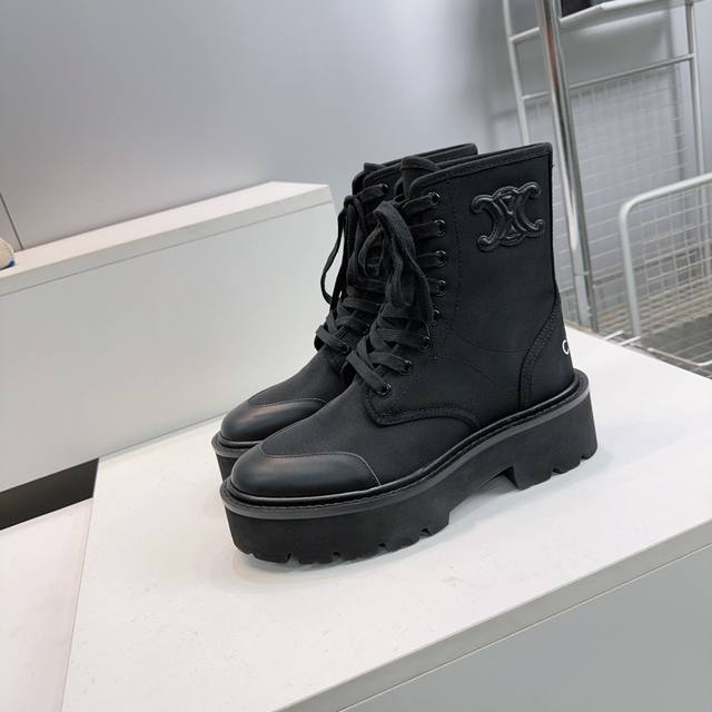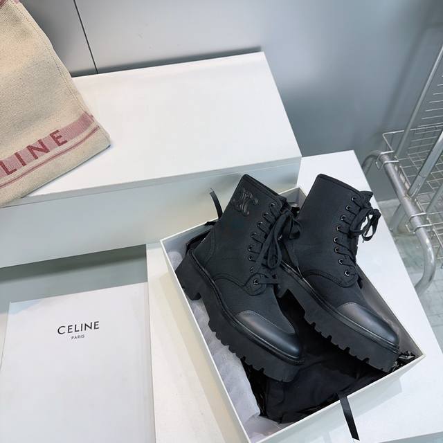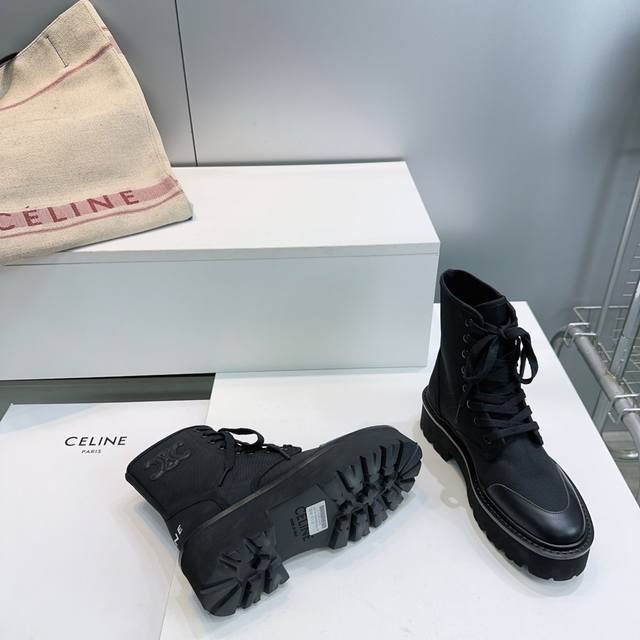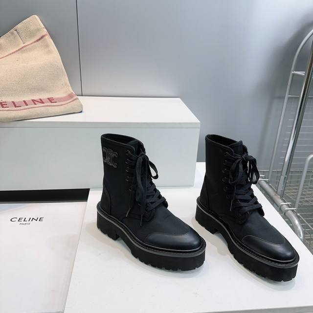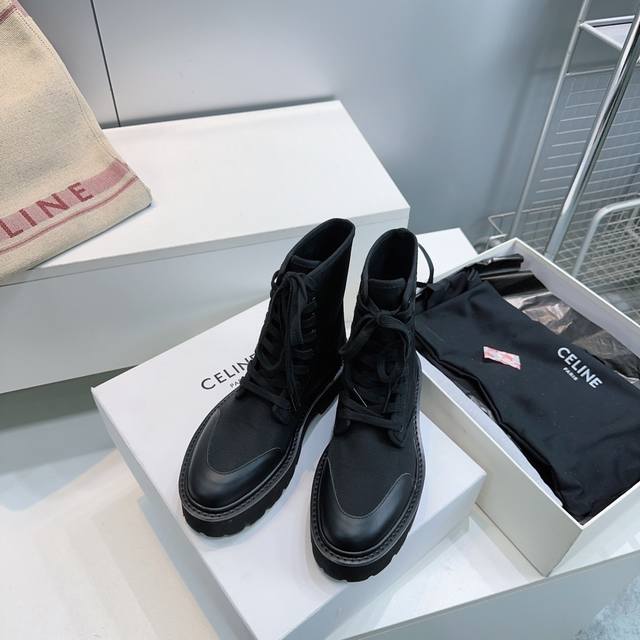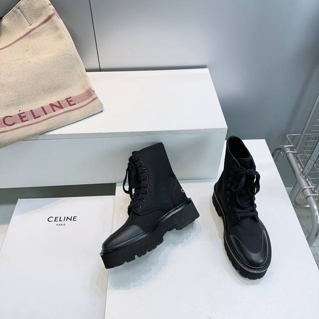 High-quality factory! Top-quality Celine 25Ss Fall/Winter classic retro platform lace-up combat boots! A trendy item exclusively customized for goddesses this fall and winter! The lace-up platform design provides height, the cut is superb, and it's a fashionable and trendy shoe that's all the rage this season. It's a versatile and stylish piece that can be both sweet and edgy, a perfect accessory! The upper is made of imported high-density canvas combined with calfskin, the inner lining is canvas, the insole is sheepskin, and it features an original molded non-slip rubber outsole! Sizes: 35-42, 40, 41, 42. Custom orders are non-refundable and non-exchangeable. Comes with original packaging.