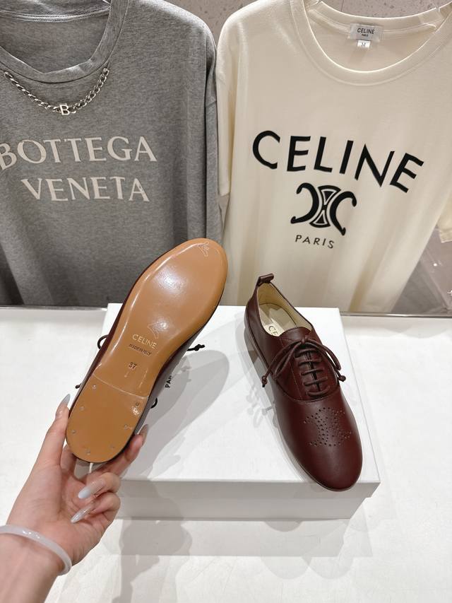 High-quality factory-made Celine F052 2025Ss new Mary Jane Brogue retro style flat casual loafers. A popular online trend! First to be experienced by major online celebrities, a must-have for Celine influencers on Instagram, very retro style, a powerful piece, with a very novel design, high-end and very comfortable. 1:1 replica of the original! Absolutely original craftsmanship! Material: Imported top-grain cowhide; Lining: Sheepskin; Outsole: Italian genuine leather; Size: 35-40 (40 sizes are custom-made and non-refundable).
