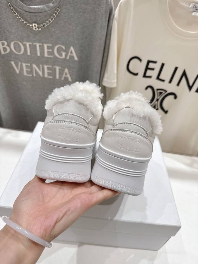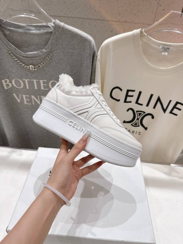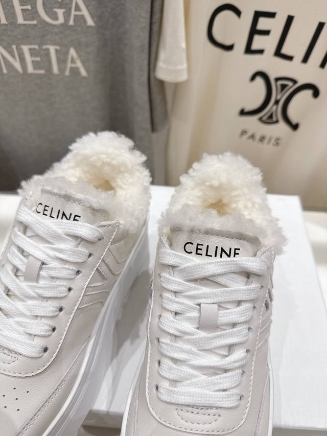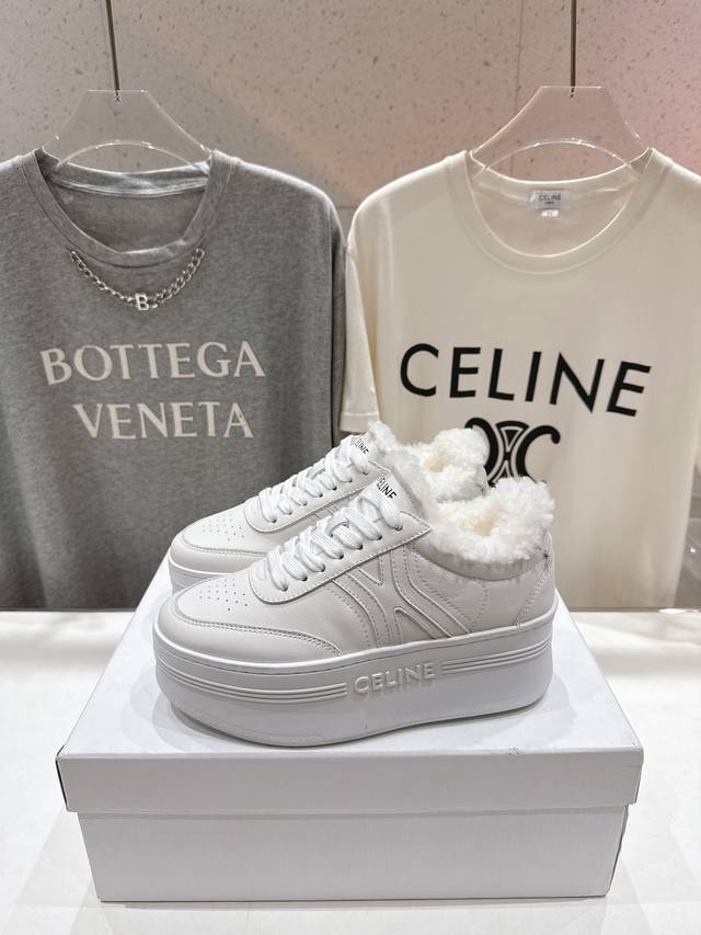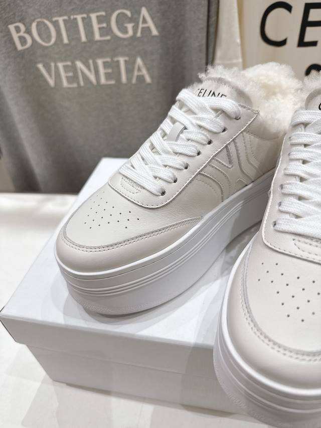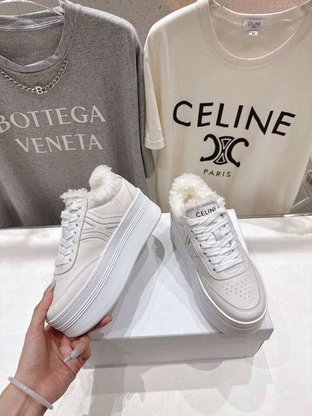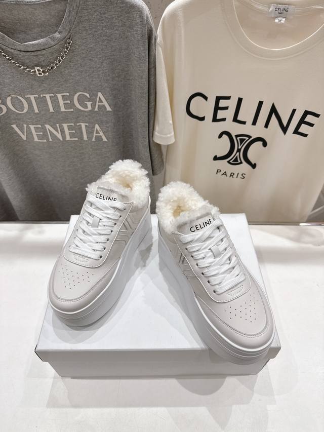 High-quality factory-made wool-lined Celine 2025Ss new logo lace-up platform wool-lined casual white sneakers. Simple and comfortable, clean and neat, height-enhancing and leg-slimming, whether worn alone or paired with wide-leg pants, high-street and retro, be a Celine girl! Upper: Imported top-grain calfskin. Lining: Imported wool. Outsole: Original 1:1 molded outsole. Sizes: 35-40, 40 custom-made.