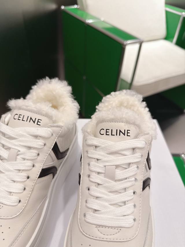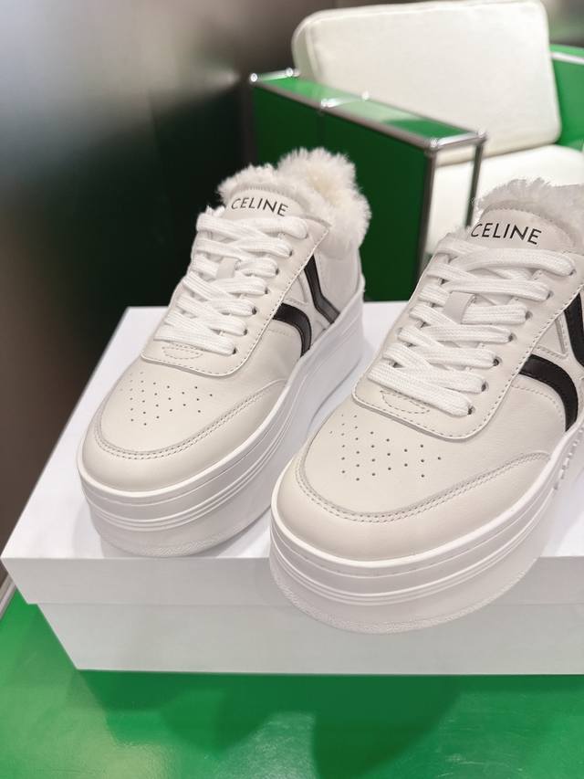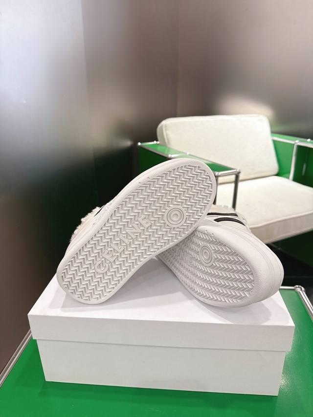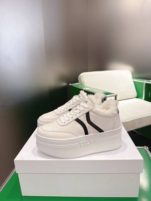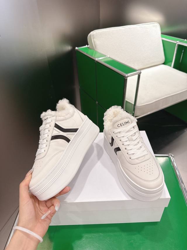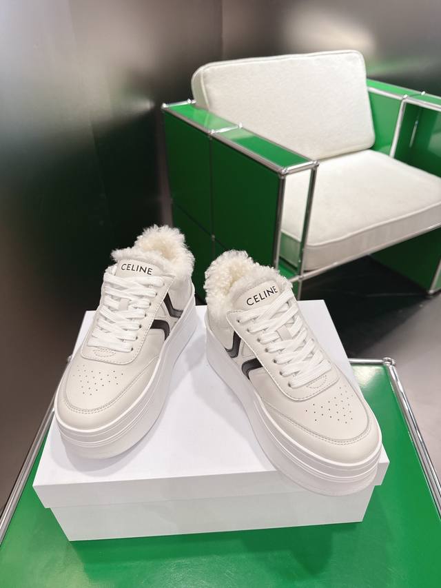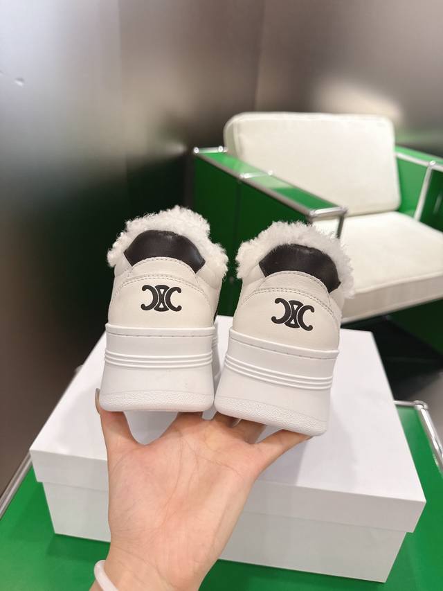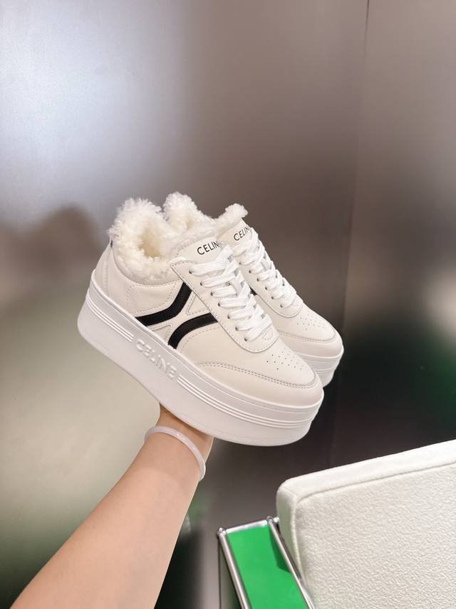K027 Celine platform sneakers, white sneakers with fur lining. New Spring/Summer 2025 women's Arc de Triomphe logo lace-up design. Simple, comfortable, clean, and flattering, these sneakers elongate the legs and make them appear slimmer. Whether worn alone or paired with wide-leg pants, they offer a high-street yet retro look. Be a Celine girl! Sizes: 35-39, 40-41 (custom made).