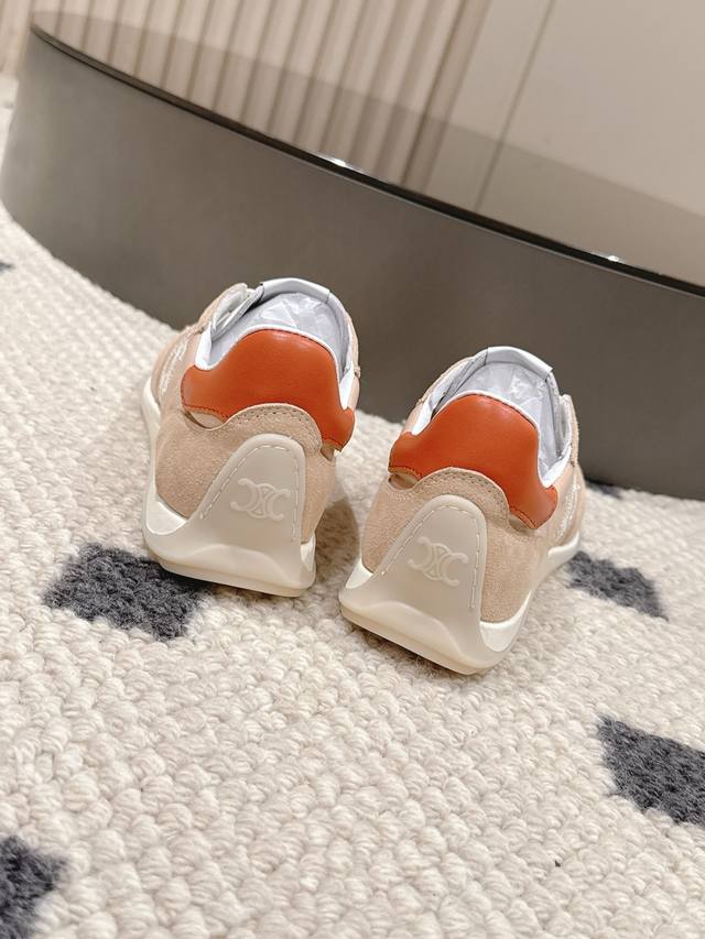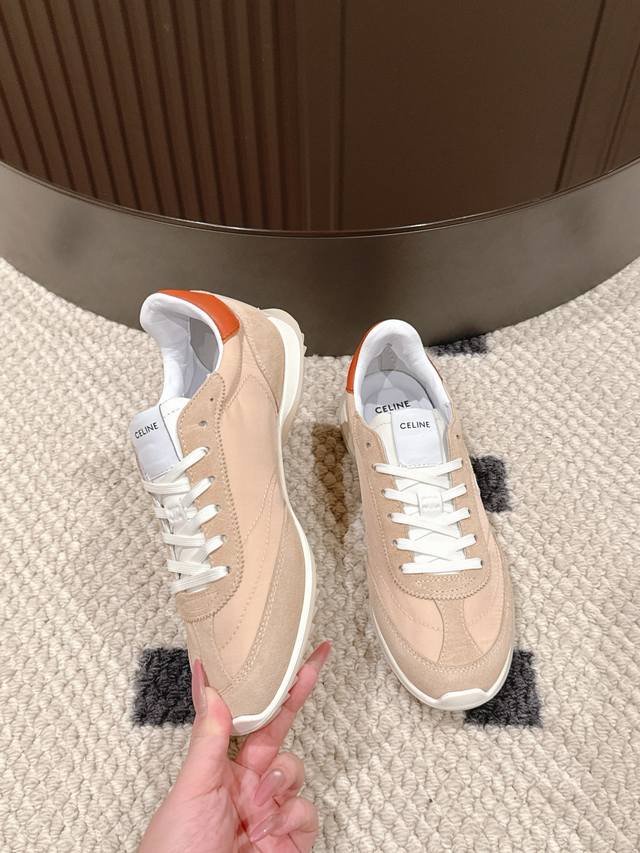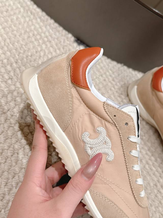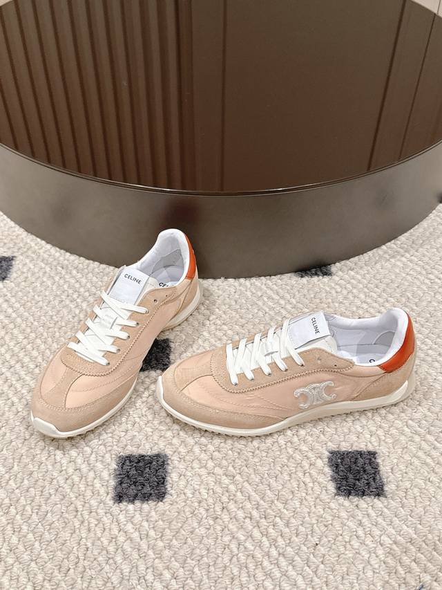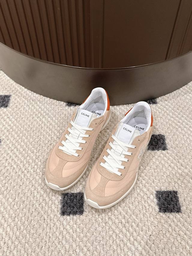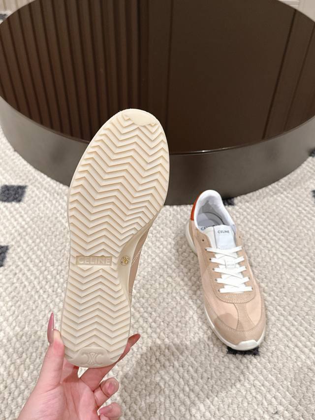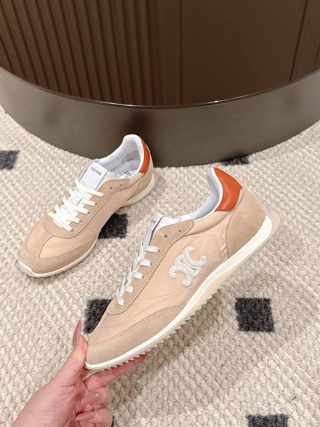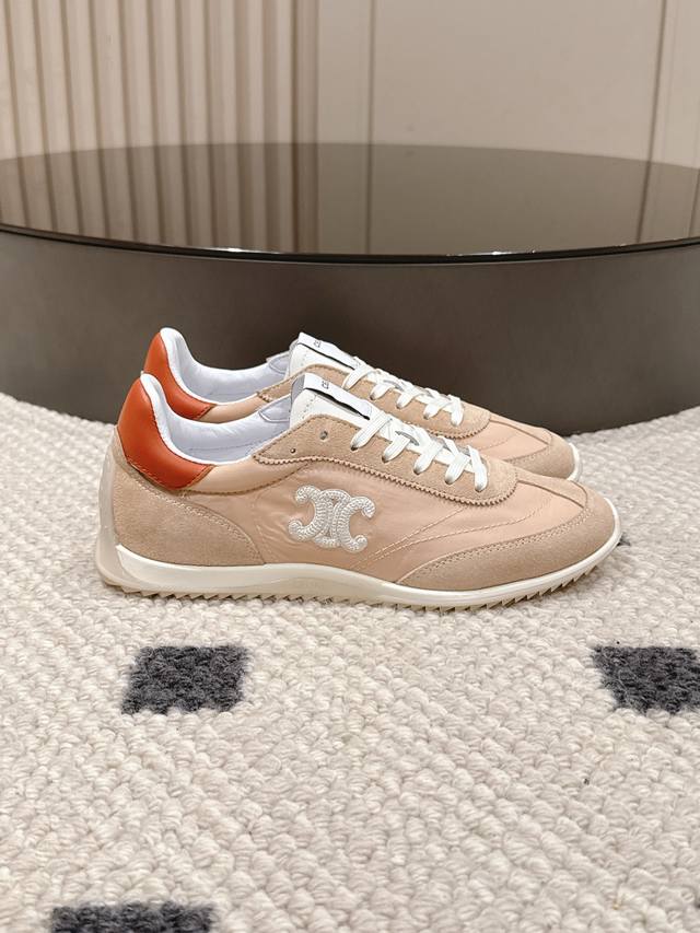 New color. Sizes 35-40. 41 (Custom made) DDD Celine Racer Women's Vanilla Low-Top Sneakers, exquisitely reinterpreting 1970s sportswear, blending nostalgic charm with modern elegance. As a new member of the Celine footwear collection, the Racer showcases effortless Parisian chic with its lightweight silhouette, providing all-day comfort. The upper is crafted from nylon, suede calfskin, and smooth calfskin, with a rich combination of textures enhancing the retro running shoe's design. Its construction balances breathability and structure, perfectly complementing both casual and sophisticated looks. The iconic Triomphe logo embodies the brand's refined aesthetics, embroidered on the side panels and embossed on the heel, paying subtle yet luxurious tribute to Celine's heritage. The Celine Racer sneakers feature a soft vanilla hue, combining clean lines and premium materials to create a simple yet impactful style! DDD