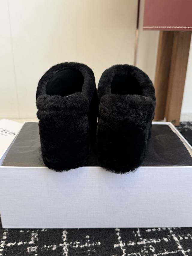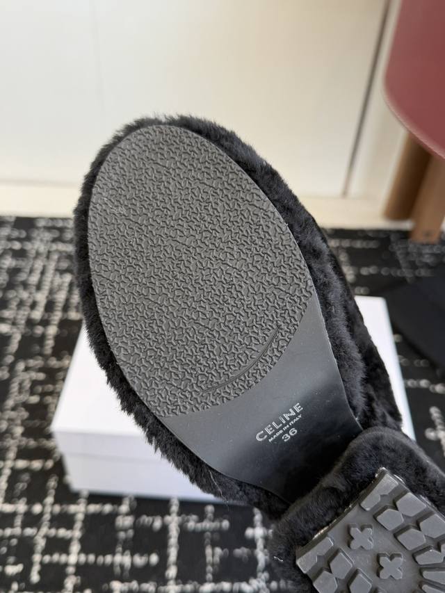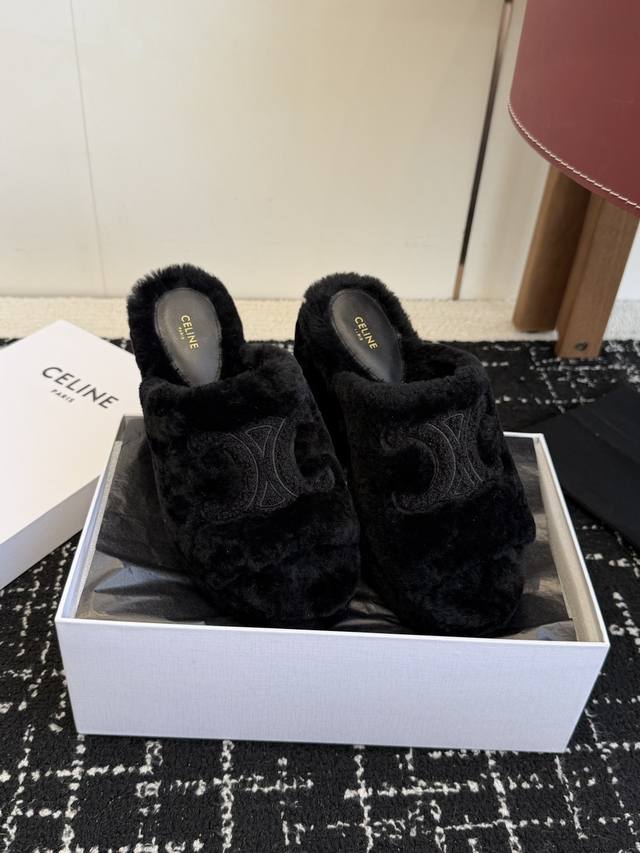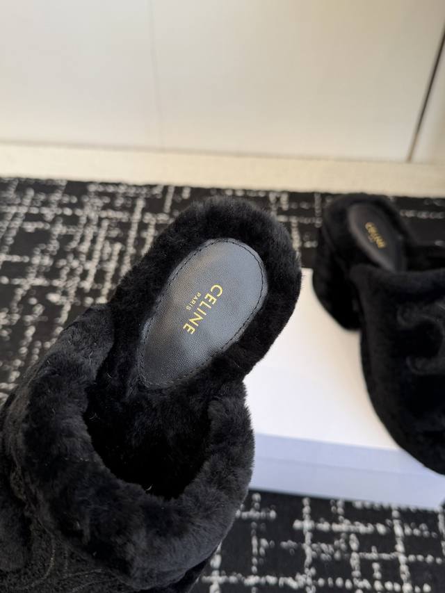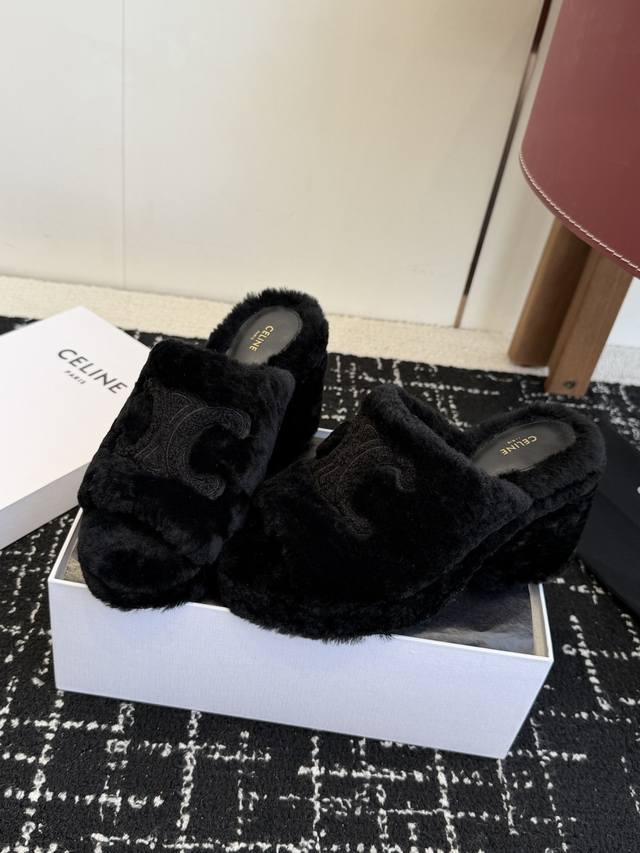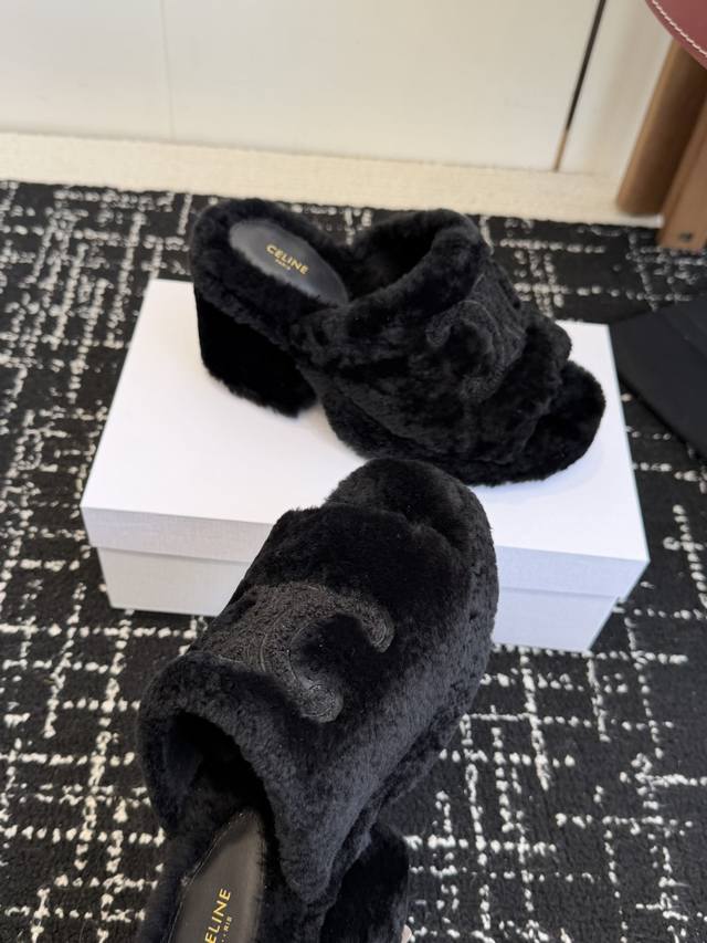 Retail Item DDD Celine 25Wf Arc de Triomphe Platform High-Heeled Fleece Slippers DDD Step into the world of Celine fleece slippers and encounter a meeting of comfort and luxury. DDD It cleverly blends the brand's classic design with cutting-edge fashion with its unique design. The iconic Arc de Triomphe is exquisitely sewn onto the upper. DDD The striking and flamboyant golden luster shines on the fabric, telling the story of Celine's profound heritage and trendsetting attitude. DDD The perfect combination of a 2cm platform and an 8cm heel is not only a secret weapon but also a powerful source of aura. The thick design of the platform cleverly distributes pressure, making walking easier and more comfortable even after long periods of wear. The heel adds an elegant rhythm to every step, showcasing feminine charm with every gesture. DDD The rubber outsole has a clear texture and strong grip, allowing you to move steadily on both smooth and wet surfaces without fear of road conditions. The main body of the shoe is gently wrapped in soft fleece. DDD Like the warm sun in winter, every step is surrounded by warmth, gently conforming to your feet and driving away the cold. Its versatility makes it irresistible. Pair it with a simple dress for an instant elegant look, perfect for evening events and parties, making you the center of attention. Switch to jeans and a trendy top for a casual street style vibe. Perfect for going out, shopping, or just looking effortlessly chic. Made with custom-made Australian imported wool, featuring a custom-molded, non-slip outsole. Sizes: 35-39, 40, 41 (custom sizes available).