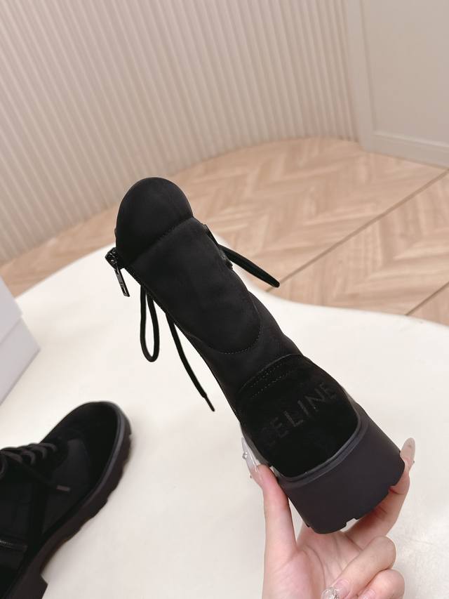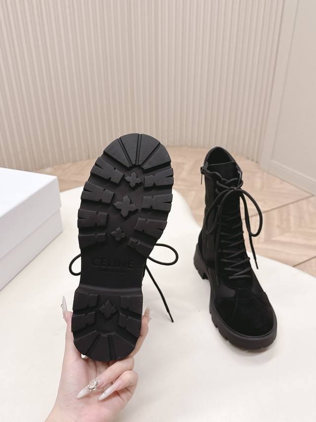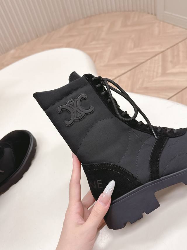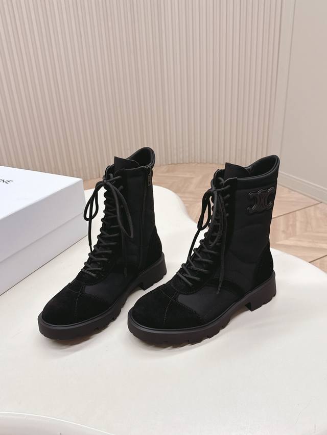 Selling Celine 2025 Fall/Winter New Arrival Margaret Arc de Triomphe Retro Hot Style Stylish Unisex Martin Boots. Incredibly slimming, classic buckle, slightly thick sole, height-enhancing and super comfortable. A must-have boot for all seasons, combining casual style and fashion. Material: Cowhide and fabric patchwork. Outsole: Original rubber. Sizes: 35, 40.