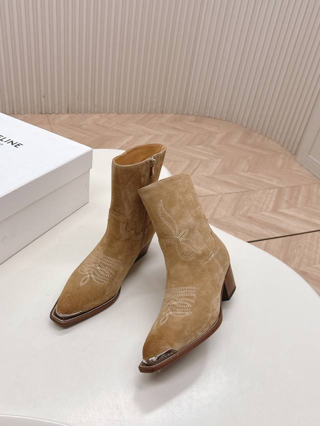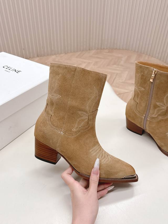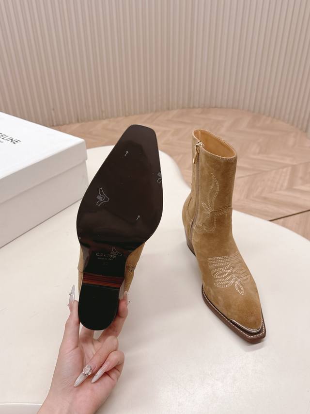 Selling the latest Celine fashion boots, runway style, and a must-have item recommended by fashion bloggers! Retro European and American style, these ankle boots feature the Arc de Triomphe logo for a high-end and sophisticated look. Suitable for all seasons. Upper: Made of original custom calfskin; Insole: Silk cowhide lining; Outsole: Imported Italian thickened genuine leather; Heel height : 4.5cm; Sizes: 35-40. DDD