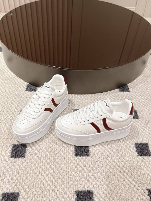 Celine 2025 New Platform 5cm Classic White Sneakers, adorned with simple yet stylish colorful lines, exuding a subtle yet sophisticated feel, every detail is exquisite. The 5cm platform design subtly adds height without looking bulky, making walking super stable.